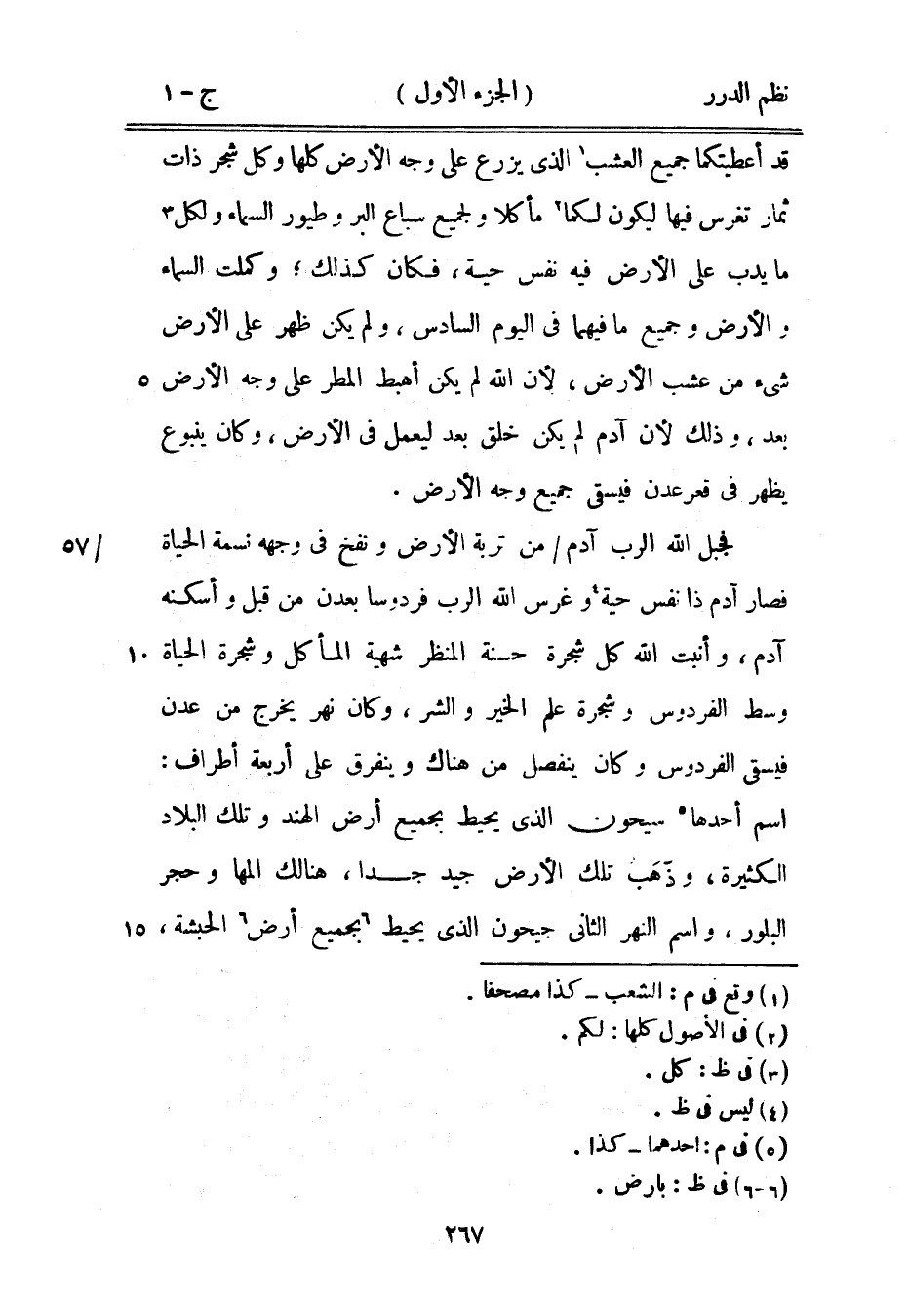 فجبل الله الرب آدم من تربة الأرض ونفخ في وجهه نسمة الحياة فصار آدم ذا نفس حية وغرس الله الرب فردوساً بعدن من قبل وأسكنه آدم، وأنبت الله كل شجرة حسنة المنظر شهية المأكل وشجرة الحياة وسط الفردوس وشجرة علم الخير والشر، وكان نهر يخرج من عدن فيسقي الفردوس وكان ينفصل من هناك وينفرق على أربعة أطراف: اسم أحدها سيحون الذي يحيط بجميع أرض الهند وتلك البلاد الكثيرة، وذَهَب تلك الأرض جيد جداً، هنالك المها وحجر البلور، واسم النهر الثاني جيحون الذي يحيط بجميع أرض الحبشة،