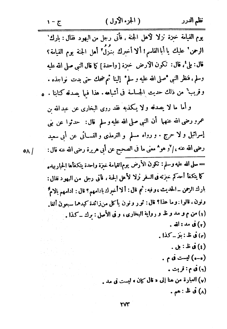 يوم القيامة خبزة نزلاً لأهل الجنة، فأتى رجل من اليهود فقال: بارك الرحمن عليك يا أبا القاسم! ألا أخبرك بنُزُل أهل الجنة يوم القيامة؟ قال: بلى. قال: تكون الأرض خبزة واحدة كما قال النبي صَلَّى اللهُ عَلَيْهِ وَسَلَّمَ، فنظر النبي صَلَّى اللهُ عَلَيْهِ وَسَلَّمَ إلينا ثم ضحك حتى بدت نواجذه» وقريب من ذلك حديث الجساسة في أشباهه. هذا فيما يصدقه كتابنا.