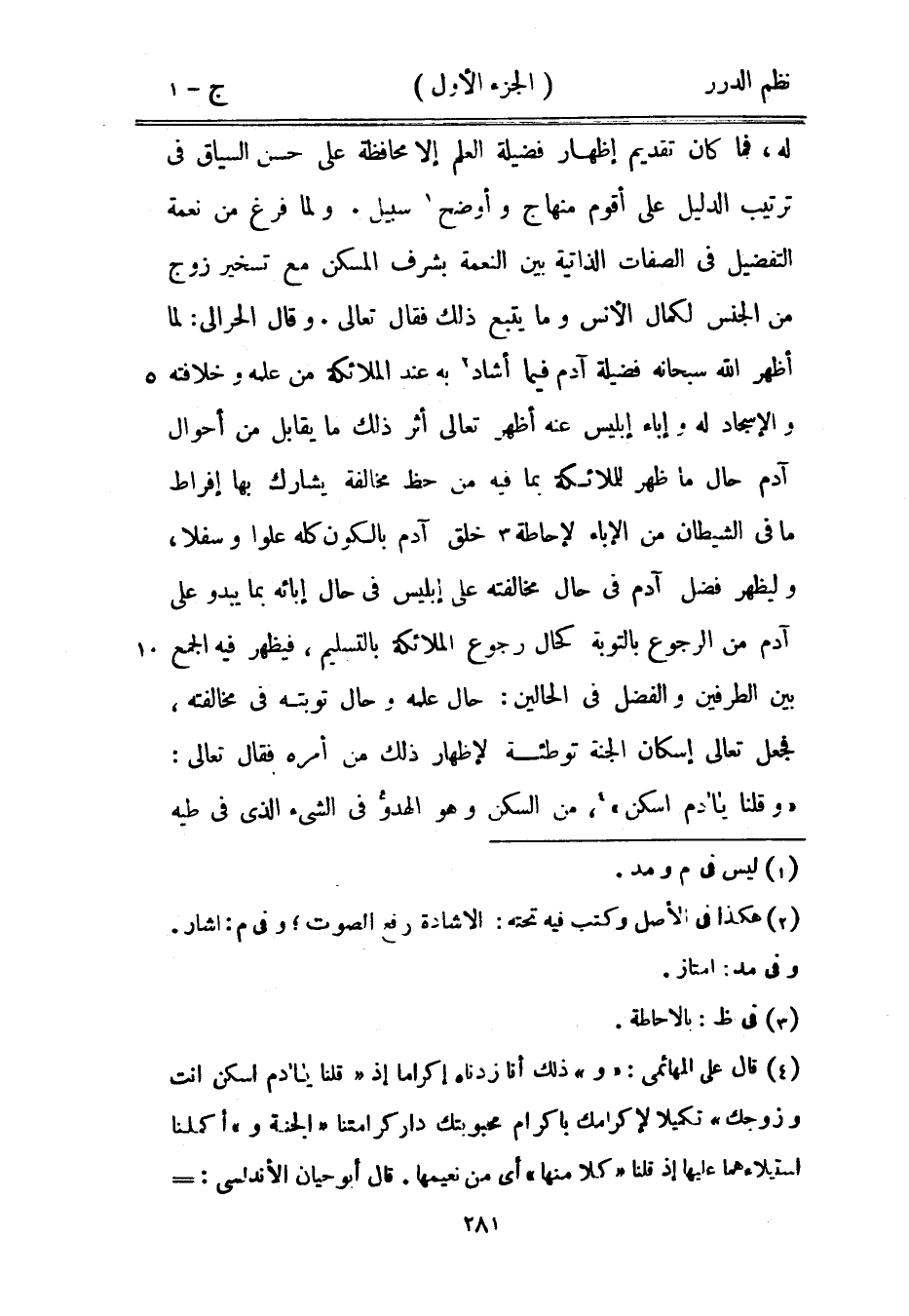 له، فما كان تقديم إظهار فضيلة العلم إلا محافظة على حسن السياق في ترتيب الدليل على أقوم منهاج وأوضح سبيل. ولما فرغ من نعمة التفضيل في الصفات الذاتية بين النعمة بشرف المسكن مع تسخير زوج من الجنس لكمال الأنس وما يتبع ذلك فقال تعالى. وقال الحرالي: لما أظهر الله سبحانه فضيلة آدم فيما أشاد به عند الملائكة من علمه وخلافته والإسجاد له وإباء إبليس عنه أظهر تعالى إثر ذلك ما يقابل من أحوال آدم حال ما ظهر للملائكة بما فيه من حظ مخالفة يشارك بها إفراط ما في الشيطان من الإباء لإحاطة خلق آدم بالكون كله علواً وسفلاً، وليظهر فضل آدم في حال مخالفته على إبليس في حال إبائه مما يبدو على آدم من الرجوع بالتوبة كحال رجوع الملائكة بالتسليم، فيظهر فيه الجمع بين الطرفين والفضل في الحالين: حال علمه وحال توبته في مخالفته، فجعل تعالى إسكان الجنة توطئة لإظهار ذلك من أمره فقال تعالى: { {وقلنا يا آدم اسكن} ، من السكن وهو الهدوء في الشيء الذي في طيه