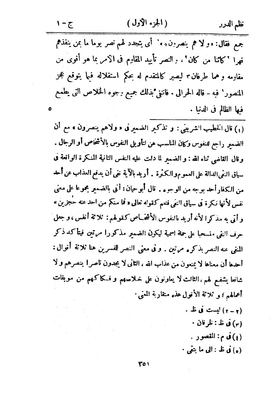 جمع فقال: {ولا هم ينصرون*} أي يتجدد لهم نصر يوماً ما بمن ينقذهم قهراً كائناً من كان، والنصر تأييد المقاوم في الأمر بما هو أقوى من مقاومة وهما طرفان ليصير كالمتقدم له بحكم استقلاله فيما يتوقع عجز المنصور فيه - قاله الحرالي. فانتفى بذلك جميع وجوه الخلاص التي يطمع فيها الظالم في الدنيا.