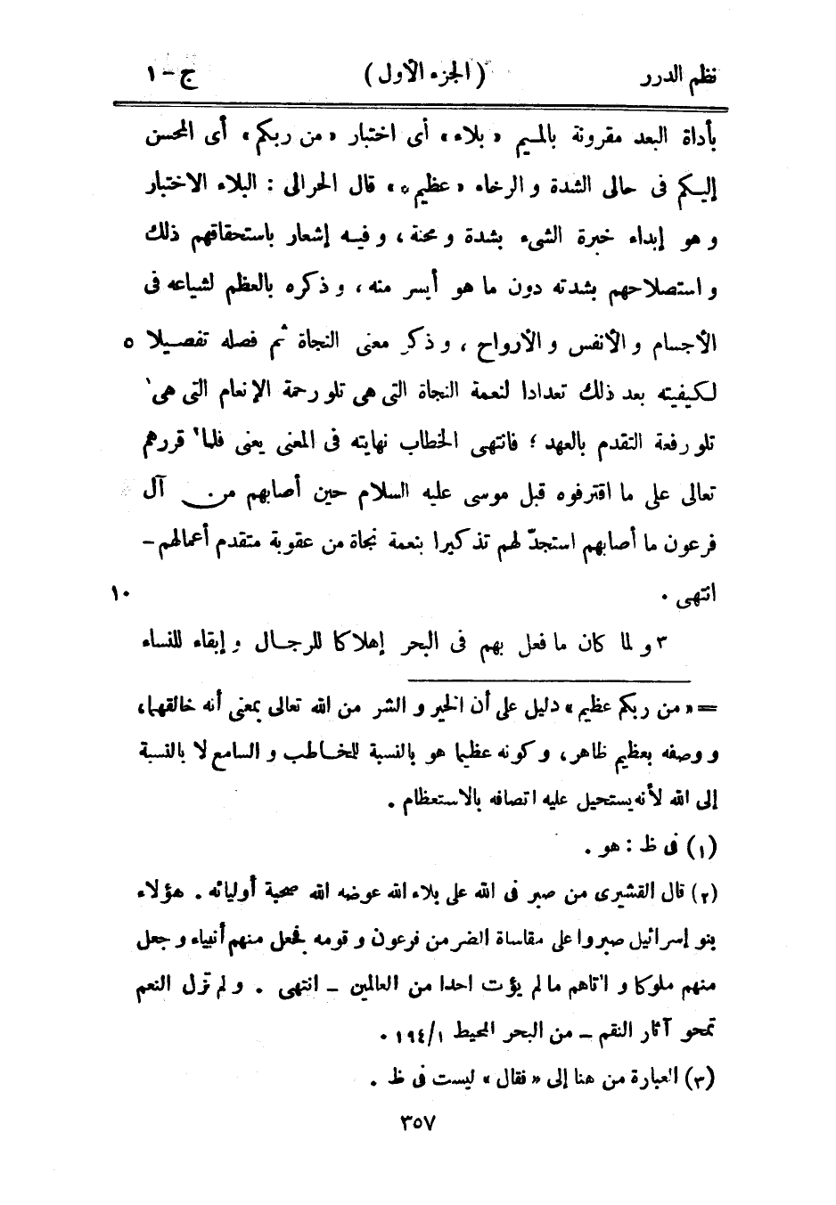 بأداة البعد مقرونة بالميم {بلاء} أي اختبار {من ربكم} أي المحسن إليكم في حالي الشدة والرخاء {عظيم*} قال الحرالي: البلاء الاختبار هو إبداء خبرة الشيء بشدة ومحنة، وفيه إشعار باستحقاقهم ذلك واستصلاحهم بشدته دون ما هو أيسر منه، وذكره بالعظم لشياعه في الأجسام والأنفس والأرواح، وذكر معنى النجاة ثم فصله تفصيلاً لكيفيته بعد ذلك تعداداً لنعمة النجاة التي هي تلو رحمة الإنعام التي هي تلو رفعة التقدم بالعهد، فانتهى الخطاب نهايته في المعنى يعني فلما قررهم تعالى على ما اقترفوه قبل موسى عليه السلام حين أصابهم من آل فرعون ما أصابهم استجدّ لهم تذكيراً بنعمة نجاة من عقوبة متقدم أعمالهم - انتهى.