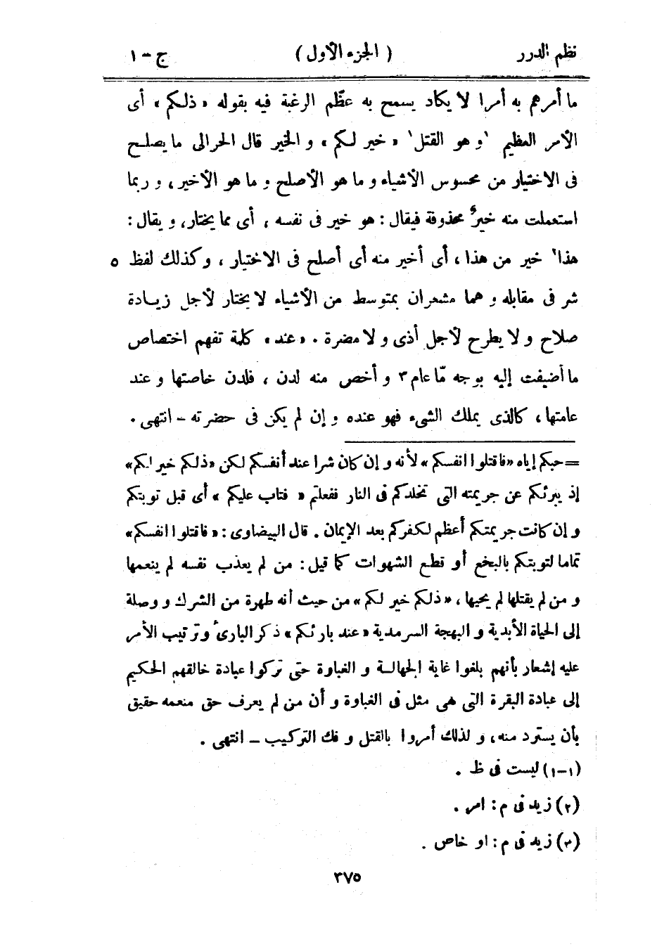 ما أمرهم به أمراً لا يكاد يسمح به عظّم الرغبة فيه بقوله {ذلكم} أي الأمر العظيم وهو القتل {خير لكم} والخير قال الحرالي ما يصلح في الاختيار من محسوس الأشياء وما هو الأصلح وما هو الأخير، وربما استعملت منه خيرٌ محذوفة فيقال: هو خير في نفسه، أي مما يختار، ويقال: هذا خير من هذا، أي أخير منه أي أصلح في الاختيار، وكذلك لفظ شر في مقابله وهما مشعران بمتوسط من الأشياء لا يختار لأجل زيادة صلاح ولا يطرح لأجل أذى ولا مضرة {عند} كلمة تفهم اختصاص ما أضيفت إليه بوجه مّا عام وأخص منه لدن، فلدن خاصتها وعند عامتها، كالذي يملك الشيء فهو عنده وإن لم يكن في حضرته - انتهى.
