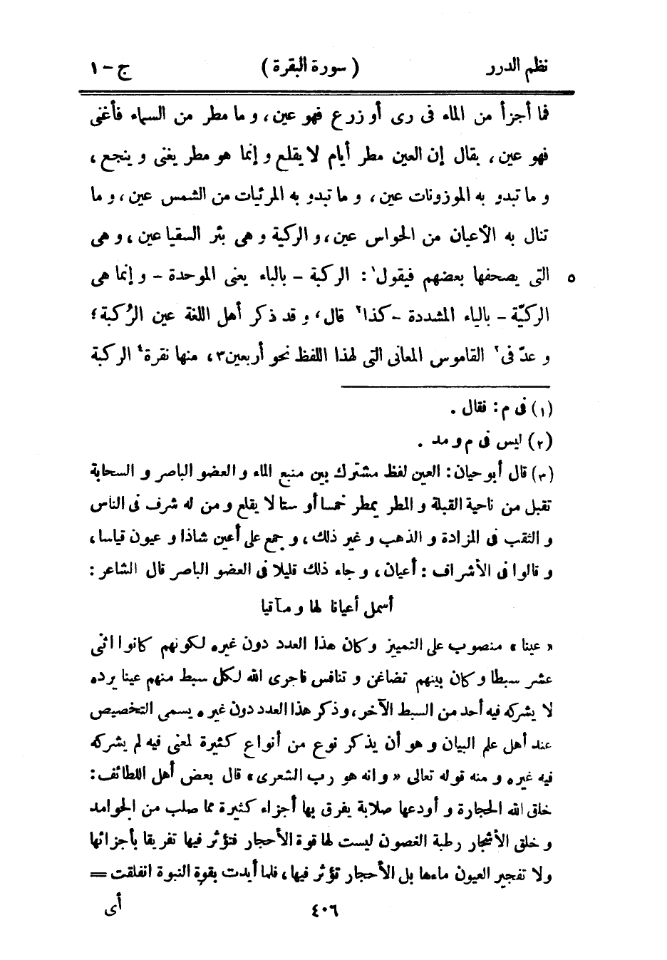 فما أجزأ من الماء في ري أو زرع فهو عين، وما مطر من السماء فأغنى فهو عين، يقال إن العين مطر أيام لا يقلع وإنما هو مطر يغني وينجع، وما تبدو به الموزونات عين، وما تبدو به المرئيات من الشمس عين، وما تنال به الأعيان من الحواس عين، والركية وهي بئر السقيا عين، وهي التي يصحفها بعضهم فيقول: الركبة - بالباء يعني الموحدة - وإنما هي الركيّة - بالياء المشددة - كذا قال، وقد ذكر أهل اللغة عين الرُكبة؛ وعدّ في القاموس المعاني التي لهذا اللفظ نحو أربعين، منها نقرة الركبة
