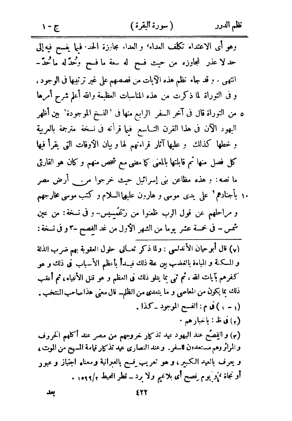 وهو أي الاعتداء تكلف العداء، والعداء مجاوزة الحد، فيما يفسح فيه إلى حد لا عذر لمجاوزه من حيث فسح له سعة ما فسح وحُدّ له ما حُدّ - انتهى. وقد جاء نظم هذه الآيات من قصصهم على غير ترتيبها في الوجود، وفي التوراة لما ذكرت من هذه المناسبات العظيمة والله أعلم شرح أمرها من التوراة قال في آخر السفر الرابع منها في النسخ الموجودة بين أظهر اليهود الآن في هذا القرن التاسع فيما قرأته في نسخة مترجمة بالعربية وخطها كذلك وعليها آثار قراءتهم لها وبيان الأوقات التي يقرأ فيها كل فصل منها ثم قابلتها بالمعنى كما مضى مع شخص منهم وكان هو القارىء ما نصه: وهذه مظاعن بني إسرائيل حيث خرجوا من أرض مصر بأجنادهم على يدي موسى وهارون عليهما السلام وكتب موسى مخارجهم ومراحلهم عن قول الرب ظعنوا من رَعَمْسِيس - وفي نسخة: من عين شمس - في خمسة عشر يوماً من الشهر الأول من غد الفِصح - وفي نسخة: