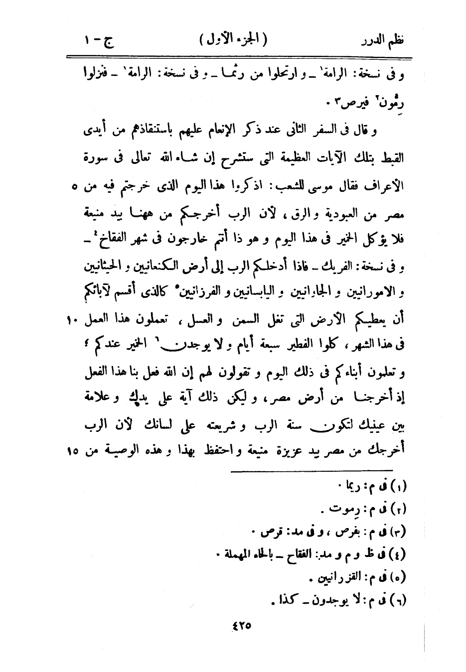 وقال في السفر الثاني عند ذكر الإنعام عليهم باستنقاذهم من أيدي القبط بتلك الآيات العظيمة التي ستشرح إن شاء الله تعالى في سورة الأعراف فقال موسى للشعب: اذكروا هذا اليوم الذي خرجتم فيه من مصر من العبودية والرق، لأن الرب أخرجكم من ههنا بيد منيعة فلا يؤكل الخمير في هذا اليوم وهو ذا أنتم خارجون في شهر الفقاخ - وفي نسخة: الفريك - فإذا أدخلكم الرب إلى أرض الكنعانيين والحيثانيين والأمورانيين والجاوانيين واليابسانيين والفرزانيين كالذي أقسم لآبائكم أن يعطيكم الأرض التي تغل السمن والعسل، تعملون هذا العمل في هذا الشهر، كلوا الفطير سبعة أيام ولا يوجدن الخمير عندكم؛ وتعلمون أبناءكم في ذلك اليوم وتقولون لهم إن الله فعل بنا هذا الفعل إذ أخرجنا من أرض مصر، وليكن ذلك آية على يدك وعلامة بين عينيك لتكون سنة الرب وشريعته على لسانك لأن الرب أخرجك من مصر بيد عزيزة منيعة واحتفظ بهذا وهذه الوصية من