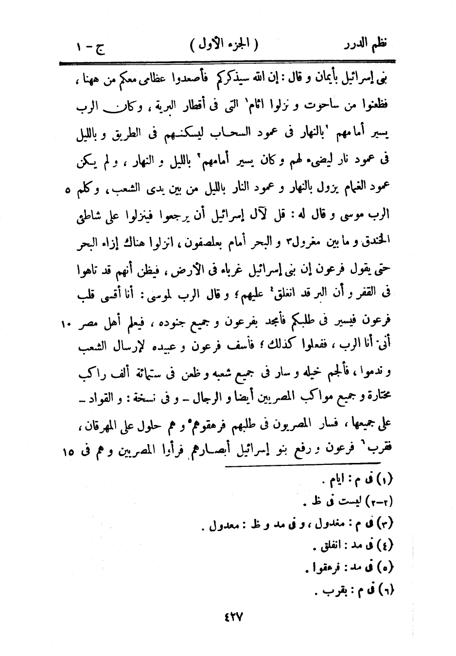 بني إسرائيل بأيمان وقال: إن الله سيذكركم فأصعدوا عظامي معكم من ههنا، فظعنوا من ساحوت ونزلوا آثام التي في أقطار البرية، وكان الرب يسير أمامهم بالنهار في عمود السحاب ليسكنهم في الطريق وبالليل في عمود نار ليضيء لهم وكان يسير أمامهم بالليل والنهار، ولم يكن عمود الغمام يزول بالنهار وعمود النار بالليل من بين يدي الشعب، وكلم الرب موسى وقال له: قل لآل إسرائيل أن يرجعوا فينزلوا على شاطىء الخندق وما بين مغرول والبحر أمام بعلصفون، انزلوا هناك إزاء البحر حتى يقول فرعون إن بني إسرائيل غرباء في الأرض، فيظن أنهم قد تاهوا في القفر وأن البر قد انغلق عليهم؛ وقال الرب لموسى: أنا أقسي قلب فرعون فيسير في طلبكم فأمجد بفرعون وجميع جنوده، فيعلم أهل مصر أني أنا الرب، ففعلوا كذلك؛ فأسف فرعون وعبيده لإرسال الشعب وندموا، فألجم خيله وسار في جميع شعبه وظعن في ستمائة ألف راكب مختارة وجميع مواكب المصريين أيضاً والرجال - وفي نسخة: والقواد - على جميعها، فسار المصريون في طلبهم فرهقوهم وهم حلول على المهرقان، فقرب فرعون ورفع بنو إسرائيل أبصارهم فرأوا المصريين وهم في