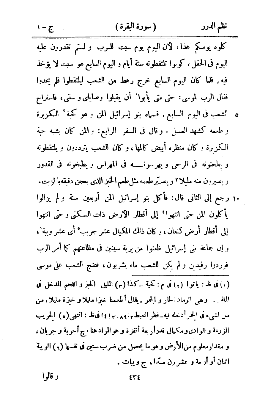وقال في السفر الرابع: والمن كان يشبه حبة الكزبرة وكان منظره أبيض كالمها، وكان الشعب يترددون ويلتقطونه ويطحنونه في الرحى ويهرسونه في المهراس ويطبخونه في القدور ويصيرون منه مليلاً ويصيّر طعمه مثل طعم الخبز الذي يعجن دقيقه بالزيت. رجع إلى الثاني قال: فأكل بنو إسرائيل المن أربعين سنة ولم يزالوا يأكلون المن حتى انتهوا إلى أقطار الأرض ذات السكنى وحتى انتهوا إلى أقطار أرض كنعان، وكان ذلك المكيال عشر جريب أي عشر ويبة، وإن جماعة بني إسرائيل ظعنوا من برية سينين في مظاعنهم كما أمر الرب فوردوا رفيدين ولم يكن للشعب ماء يشربون، فضج الشعب على موسى