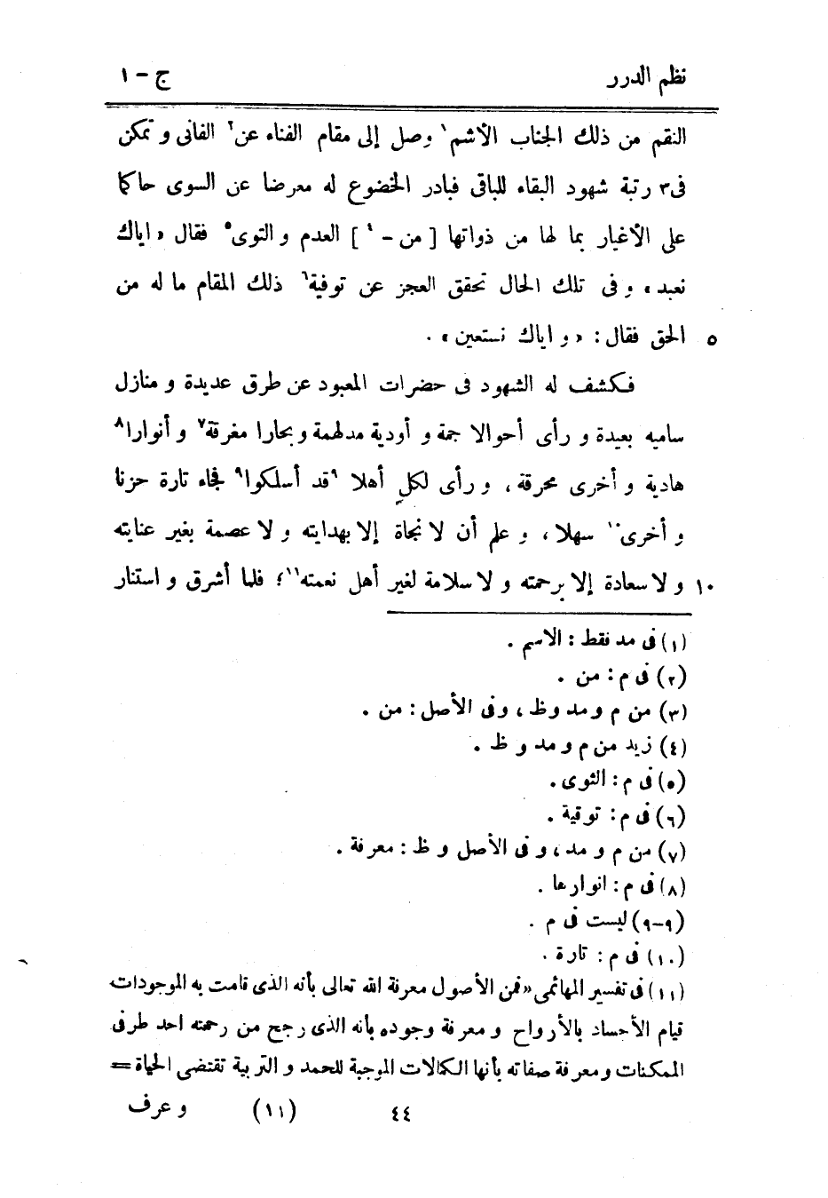 فكشف له الشهود في حضرات المعبود عن طرق عديدة ومنازل سامية بعيدة ورأى أحوالاً جمة وأودية مدلهمة وبحاراً مغرقة وأنواراً هادية وأخرى محرقة، ورأى لكل أهلاً قد أسلكوا فجاء تارة حزناً وأخرى سهلاً، وعلم أن لا نجاة إلا بهدايته ولا عصمة بغير عنايته ولا سعادة إلا برحمته ولا سلامة لغير أهل نعمته؛ فلما أشرق واستنار