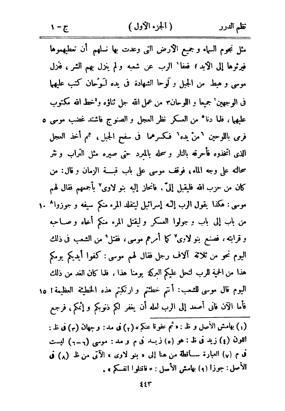 مثل نجوم السماء وجميع الأرض التي وعدت بها نسلهم أن تعطيهموها فيرثوها إلى الأبد؛ فعفا الرب عن شعبه ولم ينزل بهم الشر، فنزل موسى وهبط من الجبل ولَوحا الشهادة في يده لَوْحان كتب عليهما في الوجهين جميعاً واللوحان من عمل الله جل ثناؤه وخط الله مكتوب عليهما، فلما دنا من العسكر نظر العجل والصنوج فاشتد غضب موسى فرمى باللوحين منْ يده فكسرهما في سفح الجبل، ثم أخذ العجل الذي اتخذوه فأحرقه بالنار وسحله بالمبرد حتى صيره مثل التراب ونثر سحالته على وجه الماء، فوقف موسى على الباب قبة الزمان وقال: من كان من حزب الله فليقل إليّ، فانحاز إليه بنو لاوى بأجمعهم فقال لهم موسى: هكذا يقول الرب إله إسرائيل ليتقلد المرء منكم سيفه وجوزوا من باب إلى باب وجولوا العسكر وليقتل المرء منكم أخاه وصاحبه وقرابته، فصنع بنو لاوى كما أمرهم موسى، فقتل من الشعب في ذلك اليوم نحو من ثلاثة آلاف رجل فقال لهم موسى: كفوا أيديكم يومكم هذا من الحمية للرب لتحل عليكم البركة يومنا هذا، فلما كان الغد من ذلك اليوم قال موسى للشعب: أنتم خطئتم وارتكبتم هذه الخطيئة العظيمة! فأما الآن فإني أصعد إلى الرب لعله أن يغفر لكم ذنوبكم وإثمكم، فرجع