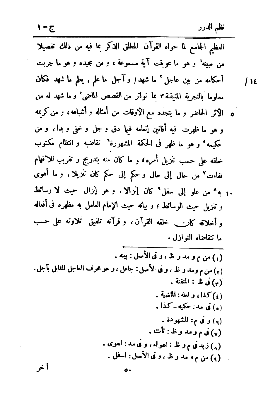 العظيم الجامع لما حواه القرآن المطلق الذكر بما فيه من ذلك تفصيلاً من مبينه وهو ما عوينت آية مسموعة، ومن مجيده وهو ما جربت أحكامه من بين عاجل ما شهد وآجل ما علم، يعلم ما شهد فكان معلوماً بالتجربة المتيقنة بما تواتر من القصص الماضي وما شهد له من الأثر الحاضر وما يتجدد مع الأوقات من أمثاله وأشباهه، ومن كريمه وهو ما ظهرت فيه أفانين إنعامه فيما دق وجل وخفي وبدا، ومن حكيمه وهو ما ظهر في الحكمة المشهورة تقاضيه وانتظام مكتوب خلقه على حسب تنزيل أمره؛ وما كان منه بتدريج وتقريب للأفهام ففاءت من حال إلى حال وحكم إلى حكم كان تنزيلاً، وما أهوى به من علو إلى سفل كان إنزالاً، وهو إنزال حيث لا وسائط وتنزيل حيث الوسائط؛ وبيانه حيث الإمام العامل به مظهره في أفعاله وأخلاقه كان خلقه القرآن، وقرآنه تلفيق تلاوته على حسب ما تتقاضاه النوازل.