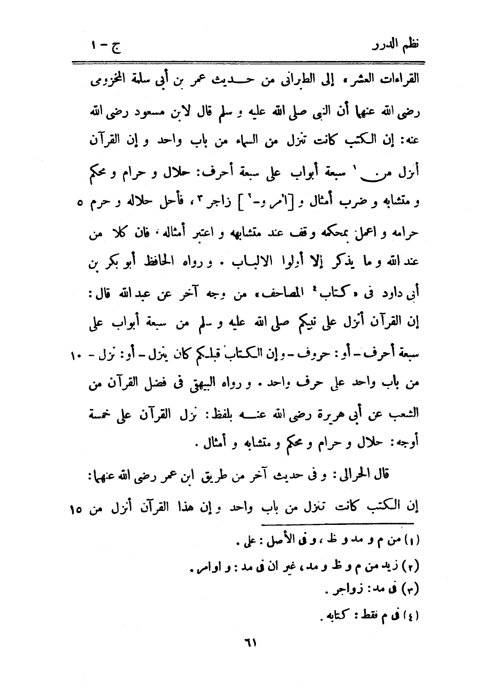 القراءات العشر " إلى الطبراني من حديث عمر بن أبي سلمة المخزومي رضي الله عنهما أن النبي (صَلَّى اللهُ عَلَيْهِ وَسَلَّمَ) قال لابن مسعود رضي الله عنه: " إن الكتب كانت تنزل من السماء من باب واحد وإن القرآن أنزل من سبعة أبواب على سبعة أحرف: حلال وحرام ومحكم ومتشابه وضرب أمثال و [آمر و] زاجر، فأحل حلاله وحرم حرامه واعم لبمحكمه وقف عند ةمتشابهه واعتبر أمثاله، فإن كلا من عند الله وما يذكر إلا أولو الألباب ورواه الحافظ أبو بكر بن أبي داود في متالب المصاحف " من وجه آخر عن عبد الله قال: " إن القرآن أنزل على نبيكم (صَلَّى اللهُ عَلَيْهِ وَسَلَّمَ) من سبعة أبواب على سبعة أحرف أو حروف. وإن الكتاب قبلكم كان ينزل أو نزل. من باب واحد على حرف واحد ورواه البيهقي في فضل القرآن من الشعب عن أبي هريرة رضي الله عنه بلفظ: " نزل القرآن على خمسة أوجه: حلال وحرام ومحكم ومتشابه وأمثال ".