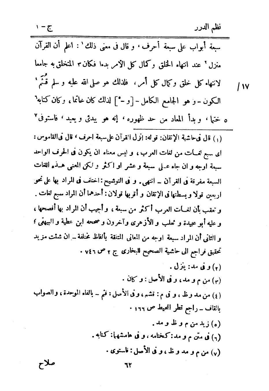 سبعة أبواب على سبعة أحرف وقال في معنى ذلك: اعلم أن القرآن منزل عند انتهاء الخلق وكمال كل الأمر بدءاً فكان