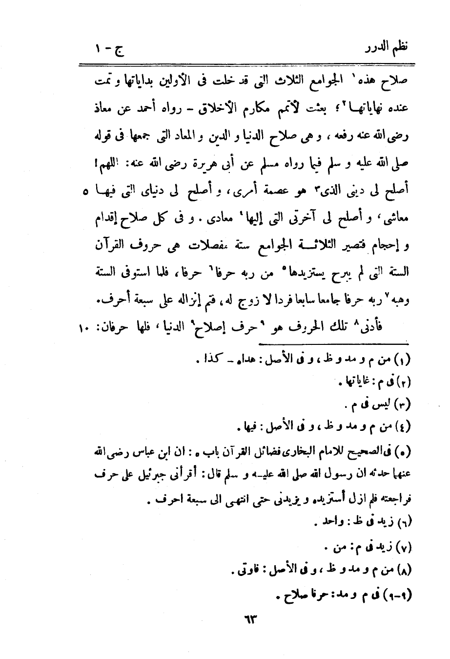 صلاح هذه الجوامع الثلاث التي قد خلت في الأولين بداياتها وتمت عنده نهاياتها " بعثت لأتمم مكارم الأخلاق " رواه أحمد عن معاذ رضي الله عنه رفعه، وهي صلاح الدنيا والدين والمعاد التي جمعها في قوله (صَلَّى اللهُ عَلَيْهِ وَسَلَّمَ) فيما رواه مسلم عن أبي هريرة رضي الله عنه: " اللهم أصلح لي ديني الذي هو عصمة أمري، أصلح لي دنياي التي فيها معاشي، وأصلح لي آخرتي التي إليها معادي " وفي كل صلاح إقدام وأحجام فتصير الثلاثة الجوامع ستة مفصلات هي حروف القرآن الستة التي لم يبرح يستزيدها من ربه حرفا حرفا، فلما استوفى الستة وهبه ربه حرفا جامعا سابعا فردا لا زوج له ن فتم إنزاله على سبعة أحرف.