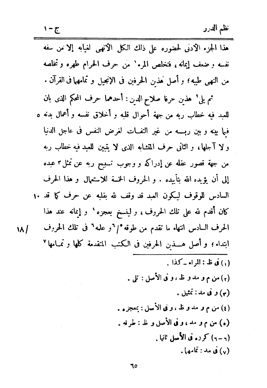 ثم يلي هذين حرفا صلاح الدين: أحدهما حرف المحكم الذي بان للعبد فيه خطاب ربه من جهة أحوال قلبه وأخلاق نفسه وأعمال بدنه فيما بينه وبين ربه من غير التفات لغرض النفس في عاجل الدنيا ولا آجلها، والثاني حرف المتشابه الذي لا يبين للعبد فيه خطاب ربه من جهة قصور عقله من إدراكه ووجوب تسبيح ربه عن تمثل عبده إلى أن يؤيده الله بتأييده. والحروف الخمسة للاستعمال وهذا الحرف السادس للوقوف ليكون العبد قد وقف لله بقلبه عن حرف كما قد كان أقدم لله على تلك الحروف ولينسخ بعجزه وإيمانه عند هذا الحرف السادس انتهاء ما تقدم من طوقه وعلمه في تلك الحروف ابتداء، وأصل هذين الحرفين في الكتب المتقدمة كلها وتمامها
