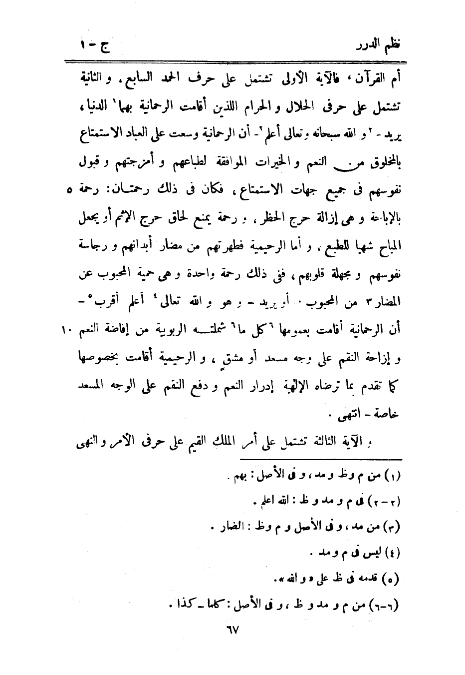 أم القرآن، فالآية الأولى تشتمل على حرف الحمد السابع، والثانية تشتمل على حرفي الحلال والحرام الذين أقامت الرحمانية بهما الدنيا يريد - والله سلحانه وتعالى أعلم - أن الرحمانية وسعت على العباد الاستمتاع بالمخلوق من النعم والخيرات الموافقة لطباعهم وأمزجتهم زقبول نفوسهم في جميع جهات الاستمتاع، فكان في ذلك رحمتان: رحم بالإباحة وهي إزالة حرج الحظر ورحمة يمنع لحاق حرج الإثم أو يجعل المباح شهيا للطبع، وأما الرحيمية فطهرتهم من مضار أبدانهم ورجاسة نفوسهم ومجهلة قلوبهم، ففي ذلك رحمة واحدة وهي حمية المحبوب عن المضار من المحبوب، أو يريد - وهو والله تعالى أعلم أقرب - أن الرحمانية أقامت بعمومها كل ما شملته الربوبية من إفاضة النعم وإزاحة النقم على وجه مسعد أو مشق، والرحيمية أقامت بخصوصها كما تقدم بما ترضاه الإلهية إدرار النعم ودفع النقم على الوجه المسعد خاصة. انتهى.