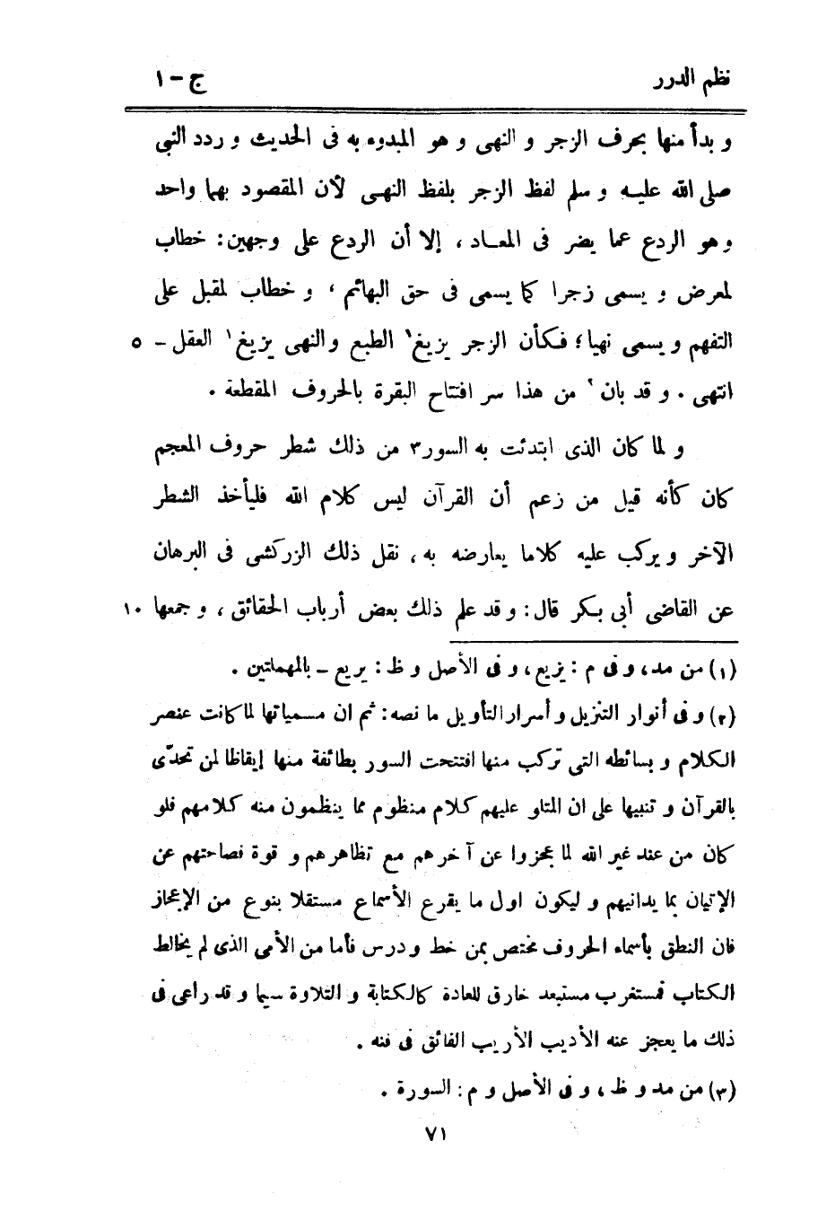 وبدأ منها بحرف الزجر والنهي وهو المبدوء به في الحديث ورده النبي (صَلَّى اللهُ عَلَيْهِ وَسَلَّمَ) لفظ الزجر بلفظ النهي لأن المقصود بهما واحد وهو الردع عما يضر في المعاد إلا أن الردع عل وجهين: خطاب لمعرض ويسمى زجرا كما يسمى في حق البهائم، وخطاب لمقبل على التفهم ويسمى نهيا، قكأن الزجر يزيع الطبع والنهي يزيع العقل، انتهى. وقد بان من هذا سر افتتاح البقرة بالمعروف المقطعة.