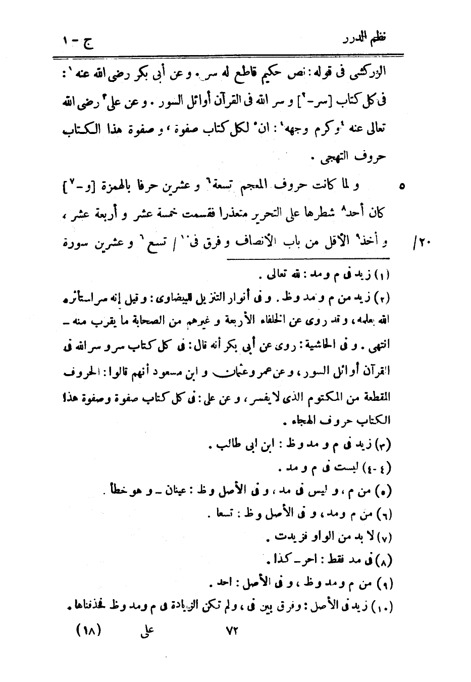 الزركشي في قوله: نص حكيم قاطع له سر، وعن أبي بكر رضي الله تعالى عنه: في كل كتا بسر وسر الله في القرآن أوائل السوروعن علي رضي الله تعالى عنه وكرم الله وجهه: أن لكل كتاب صفوة، وصفوة هذا الكتاب حروف التهجي.