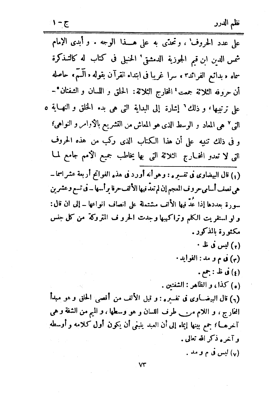 على عدد الحروف، وتحدي به على هذا الوجه، وأبدى الإمام شمس الدين ابن فقيم الجوزيه الدمشقي الحنبلي يفي كتاب به كالتذكرة سماه " بدائع الفرائد " سرا غريبا في ابتداء القرآن بقوله) الم (حاصله أن حروفه الثلاثة جمعت المخارج الثلاثية: الحلق واللسان والشفتان. على ترتيبها وذلك إشارة إلى البداية التي هي بدء الخلق والنهاية التي هي المعاد والوسط الذي هو المعاش من التشريع بالأوامر والنواهي، وفي ذلك تنبيه على أن هذا الكتاب الذي ركب من هذه الحروف التي لا تعدو المخارج الثلاثة التي بها يخاطب جميع الأمم جامع لما