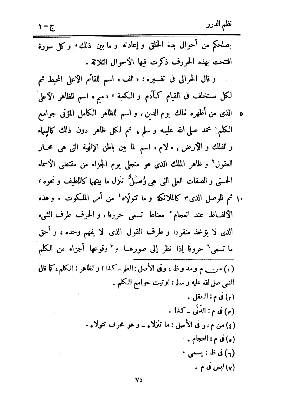 وقال الحرالي في تفسيره: " الف " اسم للقائم الأعلى المحيط ثم لكل مستخلف في القيام كآدم والكعبة، " ميم " اسم للظاهر الأعلى الذي من أظهرة ملك يوم الدين، واسم للظاهر الكامل المؤتى جوامع الكلم محمد (صَلَّى اللهُ عَلَيْهِ وَسَلَّمَ) . ثم لكل ظاهر دون ذلك كالسماء والفلك والأرض " لام " اسم لما بين باطن الإلهية التي هي محار العقول التي هي وصل تنزل ما بينهما كاللطيف ونحوه، ثم للوصل الذي كالملائكة وما تتولاه من أمر الملكوت، وهذه الألفاظ عند انعجام معناها تسمى حروفا، والحرف طرف الشيء الذي لا يؤخذ منفردا وطرف القول الذي لا يفهم وحده، وأحق ما تسمى حروفا إذا نظر إلى صورها ووقوعها أجزاء من الكلم
