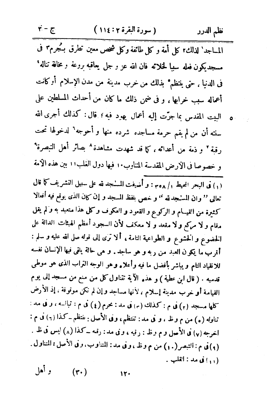 المساجد لذلك كل أمة وكل طائفة وكل شخص معين تطرق بجُرم في مسجد يكون فعله سبباً لخلائه فإن الله عز وجل يعاقبه بروعة ومخافة تناله في الدنيا، حتى ينتظم بذلك من خرب مدينة من مدن الإسلام أو كانت أعماله سبب خرابها، وفي ضمن ذلك ما كان من أحداث المسلطين على البيت المقدس بما جرّت إليه أعمال يهود فيه؛ قال: كذلك أجرى الله سنته أن من لم يقم حرمة مساجده شرده منها وأحوجه لدخولها تحت رقبة وذمة من أعدائه، كما قد شهدت مشاهدة بصائر أهل التبصرة وخصوصاً في الأرض المقدسة المتناوب فيها دول الغلب بين هذه الأمة