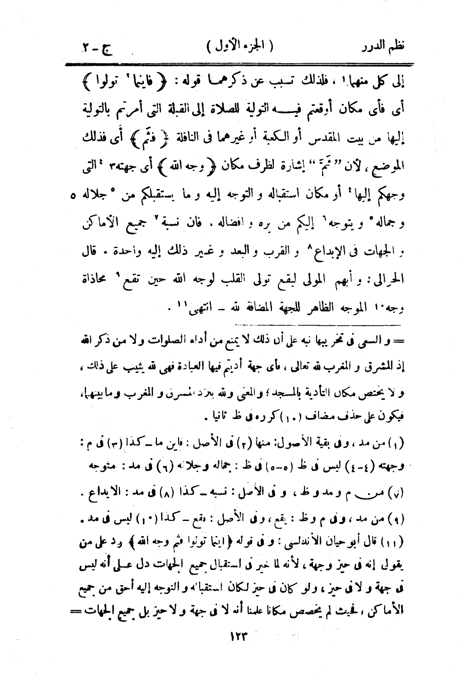 إلى كل منهما. فلذلك تسبب عن ذكرهما قوله: {فأينما تولوا} أي فأي مكان أوقعتم فيه التولية للصلاة إلى القبلة التي أمرتم بالتولية إليها من بيت المقدس أو الكعبة أو غيرهما في النافلة {فثَم} أي فذلك الموضع، لأن «ثَمَّ» إشارة لظرف مكان {وجه الله} أي جهته التي وجهكم إليها أو مكان استقباله والتوجه إليه وما يستقبلكم من جلاله وجماله ويتوجه إليكم من بره وإفضاله. فإن نسبة جميع الأماكن والجهات في الإبداع والقرب والبعد وغير ذلك إليه واحدة. قال الحرالي: وأبهم المولى ليقع تولي القلب لوجه الله حين تقع محاذاة وجه الموجه الظاهر للجهة المضافة لله - انتهى.