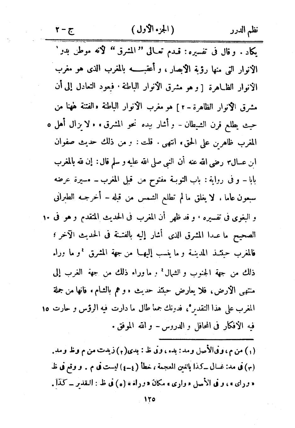 يكاد. وقال في تفسيره: قدم تعالى: {المشرق} لأنه موطن بدو الأنوار التي منها رؤية الأبصار، وأعقبه بالمغرب الذي هو مغرب الأنوار الظاهرة وهو مشرق الأنوار الباطنة، فيعود التعادل إلى أن مشرق الأنوار الظاهرة هو مغرب الأنوار الباطنة «الفتنة ههنا من حيث يطلع قرن الشيطان - وأشار بيده نحو المشرق» «لا يزال أهل المغرب ظاهرين على الحق» انتهى. قلت: ومن ذلك حديث صفوان بن عسال رضي الله عنه أن النبي صَلَّى اللهُ عَلَيْهِ وَسَلَّمَ قال: «إن لله بالمغرب باباً - وفي رواية: باب التوبة مفتوح من قبل المغرب - مسيرة عرضه سبعون عاماً، لا يغلق ما لم تطلع الشمس من قبله»