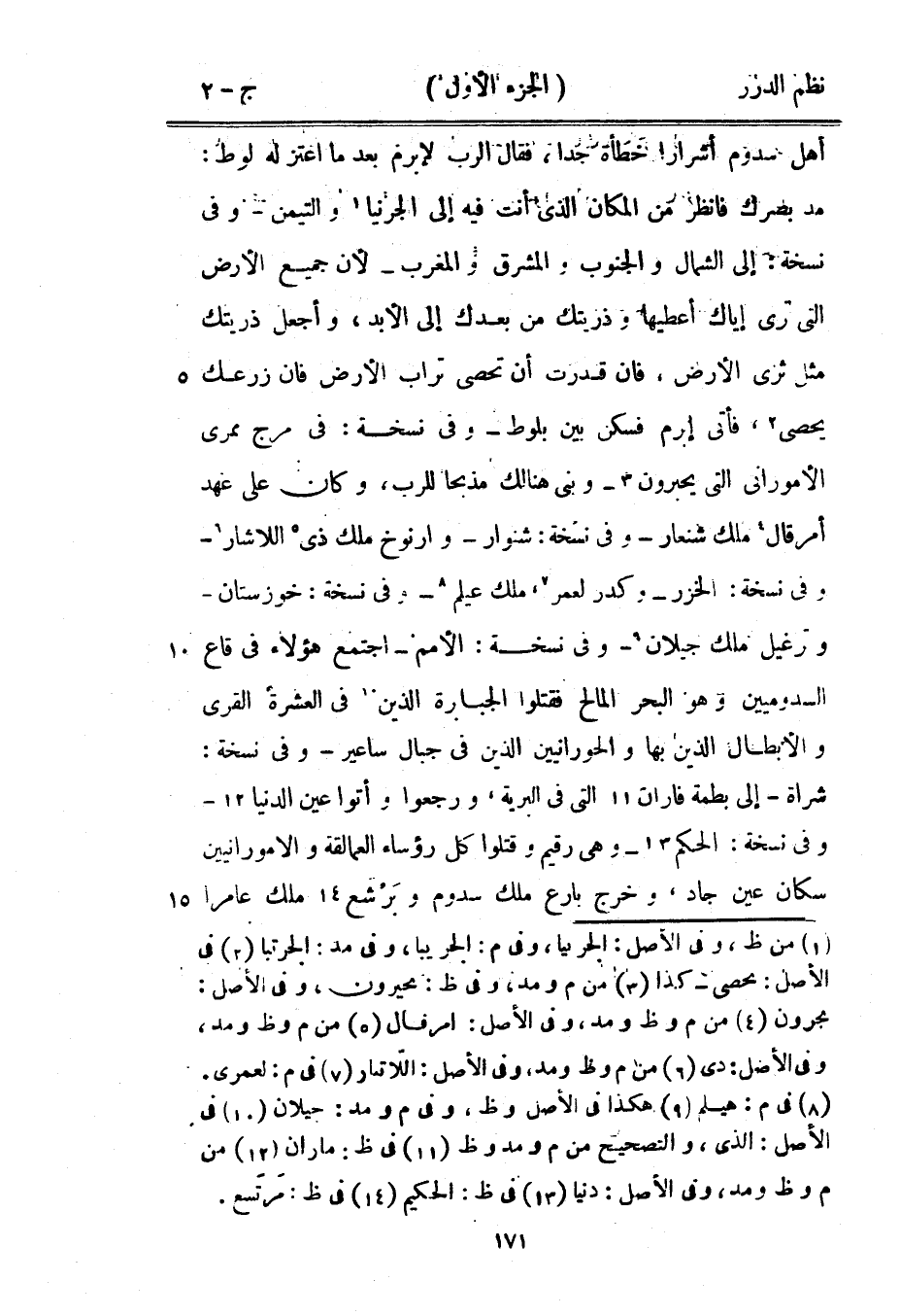 أهل سدوم أشراراً خطأة جداً، فقال الرب لإبرم بعدما اعتزله لوط: مد بصرك فانظر من المكان الذي أنت فيه إلى الجرنيا والتيمن - وفي نسخة: إلى الشمال والجنوب والمشرق والمغرب - لأن جميع الأرض التي ترى إياك أعطيها وذريتك من بعدك إلى الأبد، واجعل ذريتك مثل ثرى الأرض، فإن قدرت أن تحصي تراب الأرض فإن زرعك يحصى، فأتى إبرم فسكن بين بلوط - وفي نسخة: في مرج ممرى الأموراني التي بحبرون - وبنى هنالك مذبحاً للرب، وكان على عهد أمرقال ملك شنعار - وفي نسخة: شنوار - وأرنوخ ملك ذي اللاشار - وفي نسخة: الخزر - وكدر لعمر، ملك عيلم - وفي نسخة: خوزستان وترغيل ملك جيلان - وفي نسخة: الأمم - اجتمع هؤلاء في قاع السدوميين وهو البحر المالح فقتلوا الجبابرة الذين في العشرة القرى والأبطال الذين بها والحورانيين الذين في جبال ساعير - وفي نسخة: شراة - إلى بطمة فاران التي في البرية، ورجعوا وأتوا عين الدنيا - وفي نسخة: الحكم - وهي رقيم وقتلوا كل رؤساء العمالقة والأمورانيين سكان عين جاد، وخرج بارع ملك سدوم وبَرْشع ملك عامرا