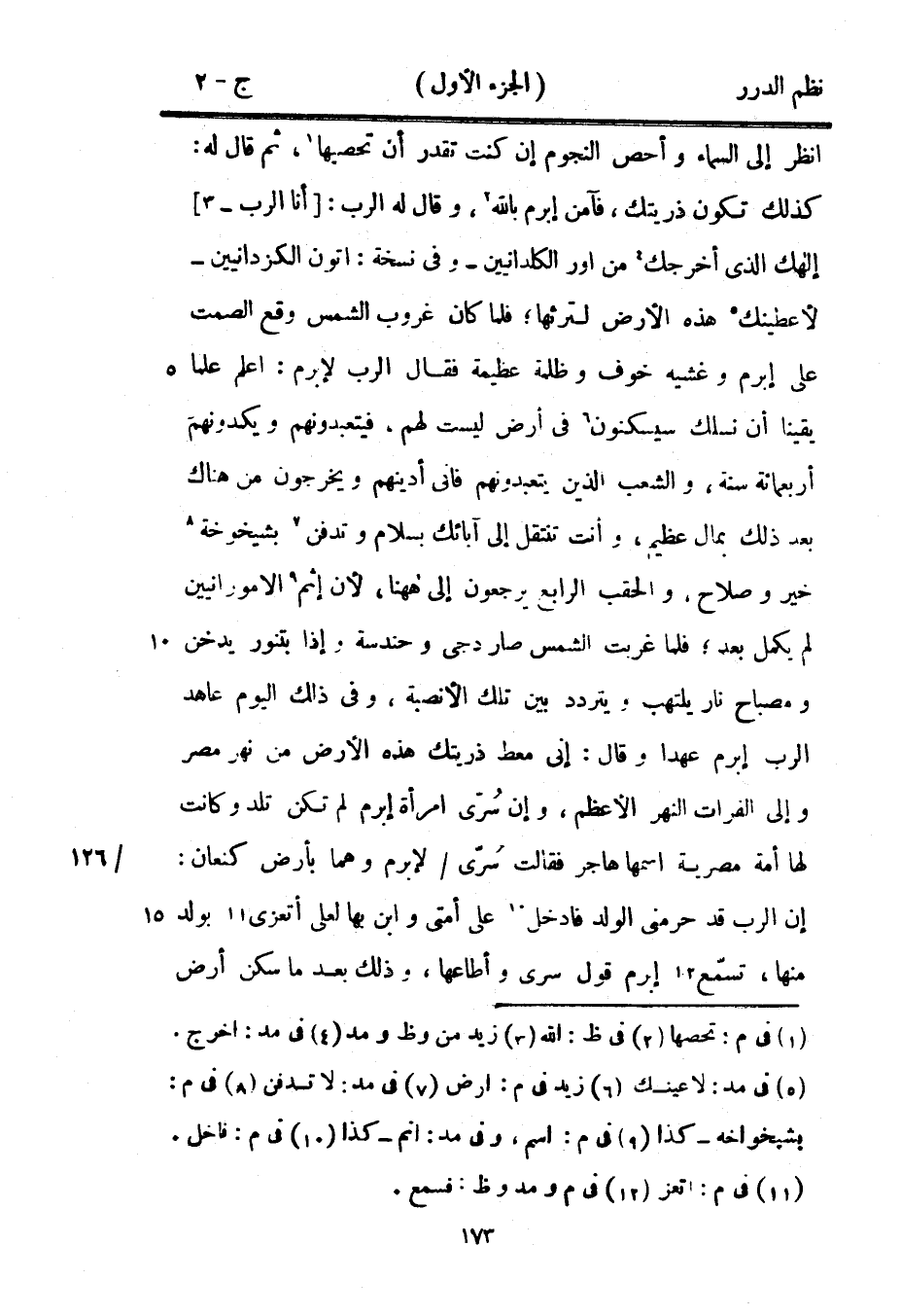 انظر إلى السماء واحص النجوم إن كنت تقدر أن تحصيها، ثم قال له: كذلك تكون ذريتك، فآمن إبرم بالله، وقال له الرب: أنا الرب إلهك الذي أخرجك من أور الكلدانيين - وفي نسخة: أتون الكزدانيين - لأعطينك هذه الأرض لترثها، فلما كان غروب الشمس وقع الصمت على إبرم وغشيه خوف وظلمة عظيمة فقال الرب لإبرم: اعلم علماً يقيناً أن نسلك سيسكنون في أرض ليست لهم، فيتعبدونهم ويكدونهم أربعمائة سنة، والشعب الذين يتعبدونهم فإني أدينهم ويخرجون من هناك بعد ذلك بمال عظيم، وأنت تنتقل إلى آبائك بسلام وتدفن بشيخوخة خير وصلاح، والحقب الرابع يرجعون إلى ههنا، لأن إثم الأمورانيين لم يكمل بعد، فلما غربت الشمس صار دجى حندسة وإذا بتنور يدخن ومصباح نار يلتهب ويتردد بين تلك الأنصبة، وفي ذلك اليوم عاهد الرب إبرم عهداً وقال: إني معط ذريتك هذه الأرض من نهر مصر وإلى الفرات النهر الأعظم، وإن سُرّى امرأة إبر لم تكن تلد وكانت لها أمة مصرية اسمها هاجر فقالت سُرّى لإبرم وهما بأرض كنعان: إن الرب قد حرمني الولد فإدخل على أمتي وابن بها لعلي أتعزى بولد منها، تسمّع إبرم قول سرى وأطاعها، وذلك بعدما سكن أرض