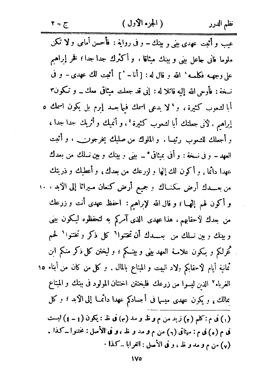 عيب وأثبت عهدي بيني وبينك - وفي رواية: فأحسن أمامي ولا تكن ملوماً فإني جاعل بيني وبينك ميثاقاً، وأكثرك جداً جداً، فخر إبراهيم على وجهه فكلمه الله وقال له: أنا أثبت لك عهدي - وفي نسخة: فأوحى الله إليه قائلاً له: إني قد جعلت ميثاقي معك - وتكون أباً لشعوب كثيرة، ولا يدعى اسمك فيما بعد إبرم بل يكون اسمك إبراهيم، لأني جعلتك أباً لشعوب كثيرة، وأنميك وأثريك جداً جداً، وأجعلك للشعوب رئيساً، والملوك من صلبك يخرجون، وأثبت العهد - وفي نسخة: وأفي بميثاقي - بيني وبينك وبين نسلك من بعدك عهداً دائماً، وأكون لك إلهاً ولزرعك من بعدك، وأعطيك وذيتك من بعدك أرض سكناك وجميع أرض كنعان ميراثاً إلى الأبد وأكون لهم إلهاً، وقال الله لإبراهيم: احفظ عهدي أنت وزرعك من بعدك لأحقابهم، هذا عهدي الذي آمركم به لتحفظوه ليكون بيني وبين نسلك من بعدك أن تختنوا كل ذكر وتختنوا لحم غُرلكم ويكون علامة العهد بيني وبينكم، وليختن كل ذكر منكم ابن ثمانية أيام لأحقابكم ولاد البيت والمبتاع بالمال.