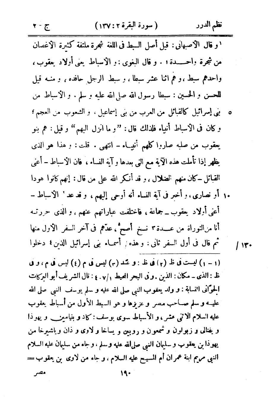 وقال الأصبهاني: قيل أصل السبط في اللغة شجرة ملتفة كثير الأغصان من شجرة واحدة، وقال البغوي: والأسباط يعني أولاد يعقوب، واحدهم سبط، وهم اثنا عشر سبطاً، وسبط الرجل حافده، ومنه قيل للحسن والحسين: سبطا رسول الله صَلَّى اللهُ عَلَيْهِ وَسَلَّمَ. والأسباط من بني إسرائيل كالقبائل من العرب من بني إسماعيل، والشعوب من العجم، وكان في الأسباط أنبياء فلذلك قال: {وما أنزل إليهم} [آل عمران: 199] وقيل: هم بنو يعقوب من صلبه صاروا كلهم أنبياء - انتهى. قلت: وهذا هو الذي يظهر إذا تأملت هذه الآية مع التي بعدها وآية النساء، فإن الأسباط - أعني القبائل - كانت منهم الضلال، وقد أنكر الله على من قال: إنهم كانوا هوداً أو نصارى، وأخبر في آية النساء أنه أوحى إليهم، وقد عد الأسباط - أعني أولاد يعقوب - جماعة، فاختلفت عباراتهم عنهم، والذي حررته أنا من التوراة من عدة نسخ أصح، عدّهم في آخر السفر الأول منها ثم قال في أول السفر ثاني: وهذه أسماء بني إسرائيل الذين دخلوا