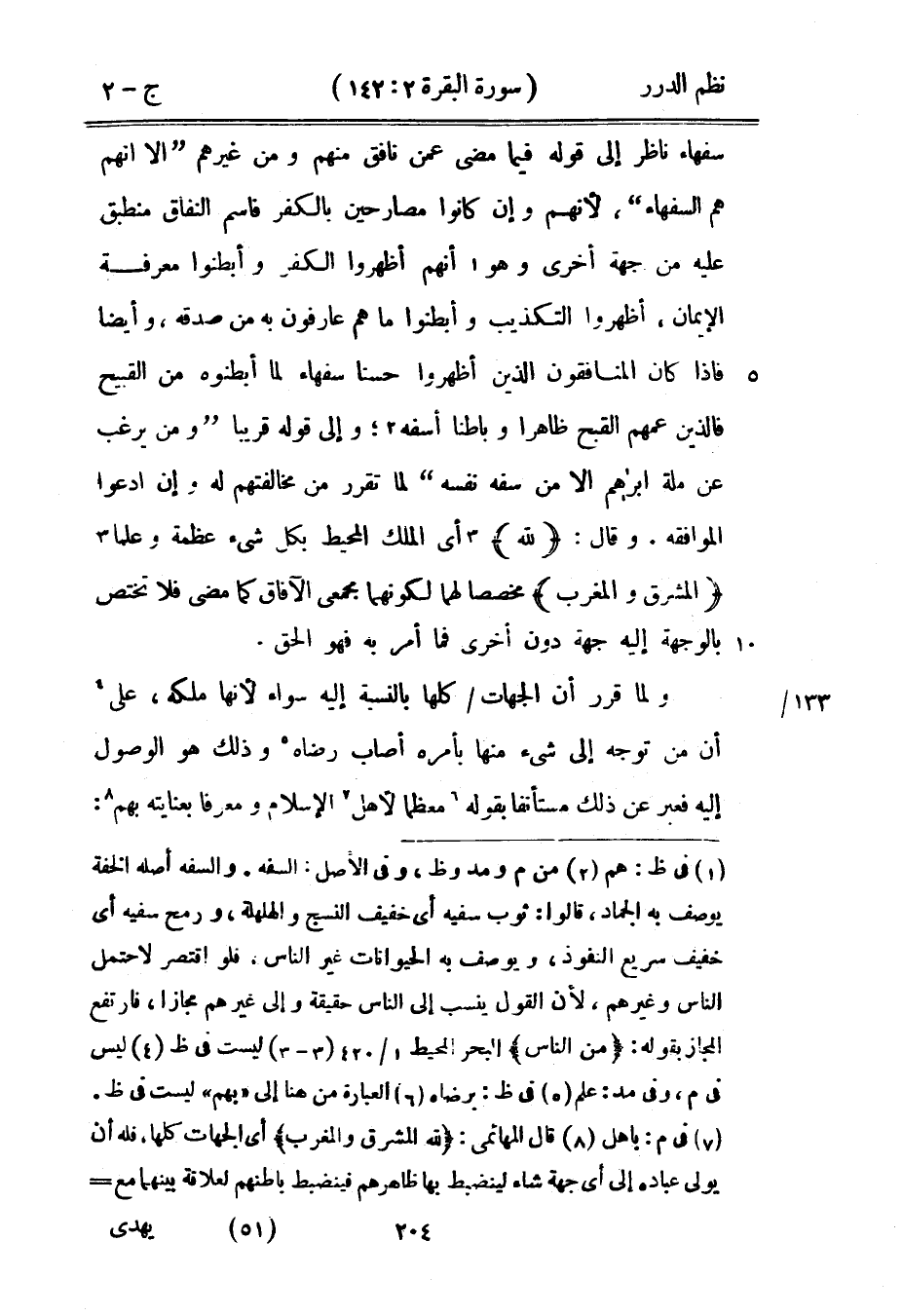 سفهاء ناظر إلى قوله فيما مضى عمن نافق منهم ومن غيرهم {ألا إنهم هم السفهاء} [البقرة: 13] ، لأنهم وإن كانوا مصارحين بالكفر فاسم النفاق منطبق عليه من جهة أخرى وهو أنهم أظهروا الكفر وأبطنوا معرفة الإيمان، أظهروا التكذيب وأبطنوا ما هم عارفون به من صدقه، وأيضاً فإذا كان المنافقون الذين أظهروا حسناً سفهاء لما أبطنوه من القبيح فالذين عمهم القبح ظاهراً وباطناً أسفه: وإلى قوله قريباً {ومن يرغب عن ملة إبراهيم إلا من سفه نفسه} [البقرة: 130] لما تقرر من مخالفتهم له وإن ادعوا الموافقة. وقال: {لله} أي الملك المحيط بكل شيء عظمة وعلماً {المشرق والمغرب} مخصصاً لهما لكونهما مجمعي الآفاق كما مضى فلا تختص بالوجهة إليه جهة دون أخرى فما أمر به فهو الحق.