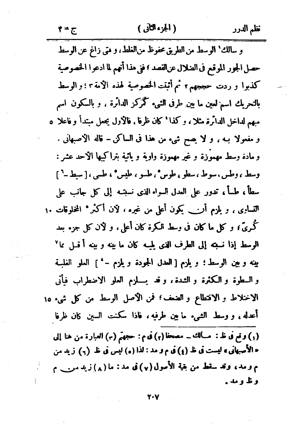 وسالك الوسط من الطريق محفوظ من الغلط، ومتى زاغ عن الوسط حصل الجور الموقع في الضلال عن القصد؛ ففي هذا أنهم لما ادعوا الخصوصية كذبوا وردت حججهم ثم أثبتت الخصوصية لهذه الأمة؛ والوسط بالتحريك اسم لعين ما بين طرفي الشيء كمركز الدائرة، وبالسكون اسم مبهم لداخل الدائرة مثلاً، وكذا كان ظرفاً، فالأول يجعل مبتدأ وفاعلاً ومفعولاً به، ولا يصح شيء من هذا في الساكن - قاله الأصبهاني.