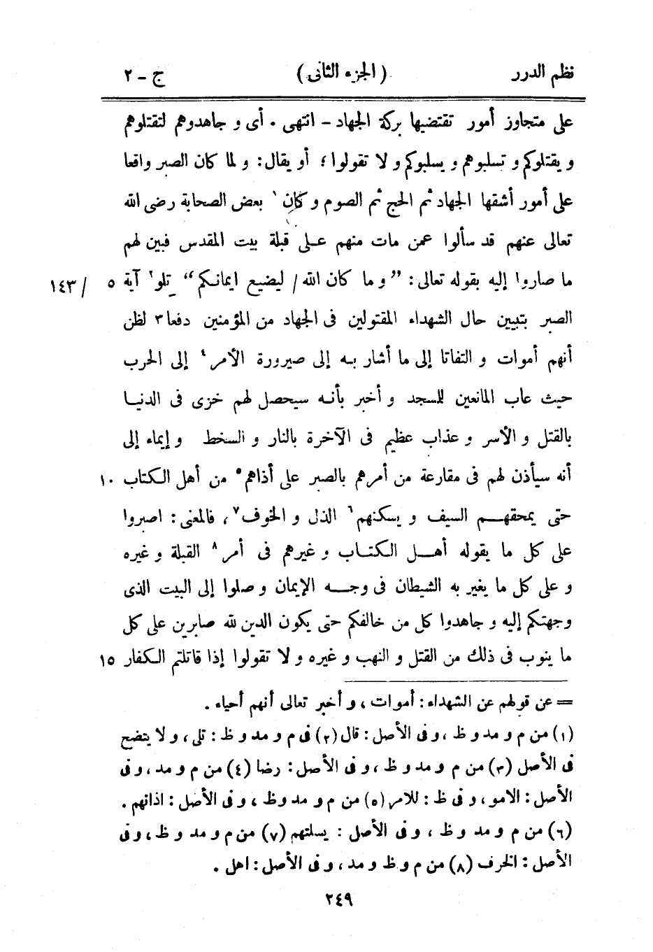 على متجاوز أمور تقتضيها بركة الجهاد - انتهى. أي وجاهدوهم لتقتلوهم ويقتلوكم وتسلبوهم ويسلبوكم ولا تقولوا، أو يقال: ولما كان الصبر واقعاً على أمور أشقها الجهاد ثم الحج ثم الصوم وكان بعض الصحابة رضي الله تعالى عنهم قد سألوا عمن مات منهم على قبلة بيت المقدس فبين لهم ما صاروا إليه بقوله تعالى: {وما كان الله ليضيع إيمانكم} [البقرة: 143] تِلو آية الصبر بتبيين حال الشهداء المقتولين في الجهاد من المؤمنين دفعاً لظن أنهم أموات والتفاتاً إلى ما أشار به إلى صيرورة الأمر إلى الحرب حيث عاب المانعين للمسجد وأخبر بأنه سيحصل لهم خزي في الدنيا بالقتل والأسر وعذاب عظيم في الآخرة بالنار والسخط، وإيماء إلى أنه سيأذن لهم في مقارعة من أمرهم بالصبر على أذاهم من أهل الكتاب حتى يمحقهم السيف ويسكنهم الذل والخوف، فالمعنى: اصبروا على كل ما يقوله أهل الكتاب وغيرهم في أمر القبلة وغيره وعلى كل ما يغير به الشيطان في وجه الإيمان وصلوا إلى البيت الذي وجهتكم إليه وجاهدوا كل من خالفكم حتى يكون الدين لله صابرين على كل ما ينوب في ذلك من القتل والنهب وغيره ولا تقولوا إذا قاتلتم الكفار