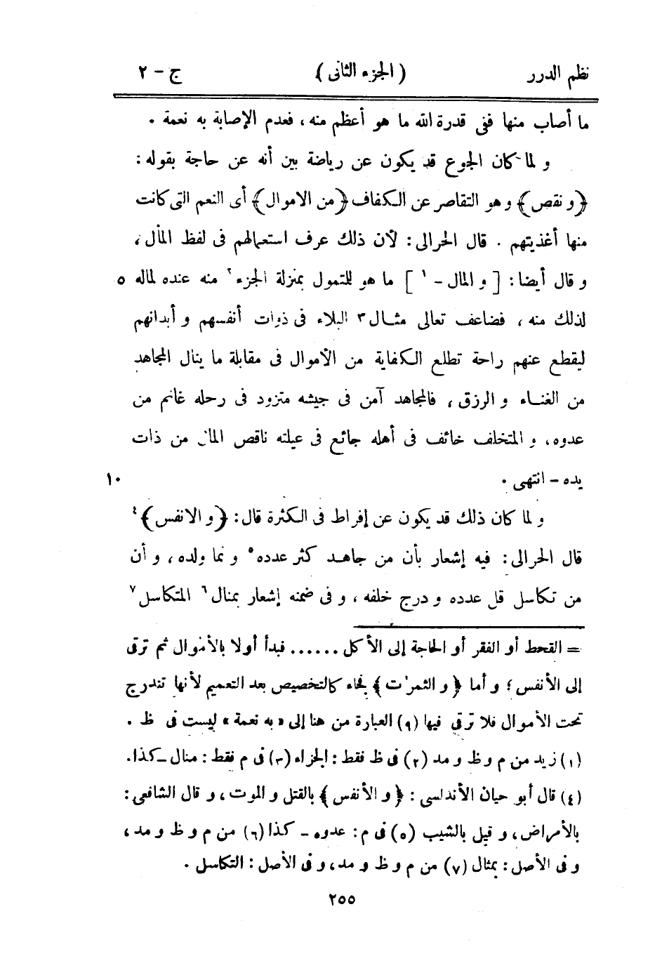 ولما كان الجوع قد يكون عن رياضة بين أنه عن حاجة بقوله: {ونقص} وهو التقاصر عن الكفاف {من الأموال} أي النعم التي كانت منها أغذيتهم. قال الحرالي: لأن ذلك عرف استعمالهم في لفظ المال. وقال أيضاً: والمال ما هو للمتمول بمنزلة الجزء منه عنده لماله لذلك منه، فضاعف تعالى مثال البلاء في ذوات أنفسهم وأبدانهم ليقطع عنهم راحة تطلع الكفاية من الأموال في مقابلة ما ينال المجاهد من الغناء والرزق، فالمجاهد آمن في جيشه متزود في رحله غانم من عدوه، والمتخلف خائف في أهله جائع في عيلته ناقص المال من ذات يده - انتهى.
