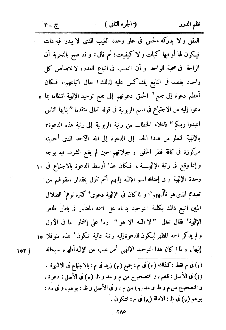 العقل ولا يدركه الحس في علو وحدة الغيب الذي لا يبدو فيه ذات فيكون لها أو فيها كميات ولا كيفيات؛ ثم قال: وقد صح بالتجربة أن الراحة في حصبة الواحد وأن التعب في اتباع العدد لاختصاص كل واحد بقصد في التابع يتشاكس عليه لذلك حال اتباعهم، فكان أعظم دعوة إلى جمع الخلق دعوتهم إلى جمع توحيد الإلهية انتظاماً بما دعوا إليه من الاجتماع في اسم الربوبية في قوله تعالى متقدماً