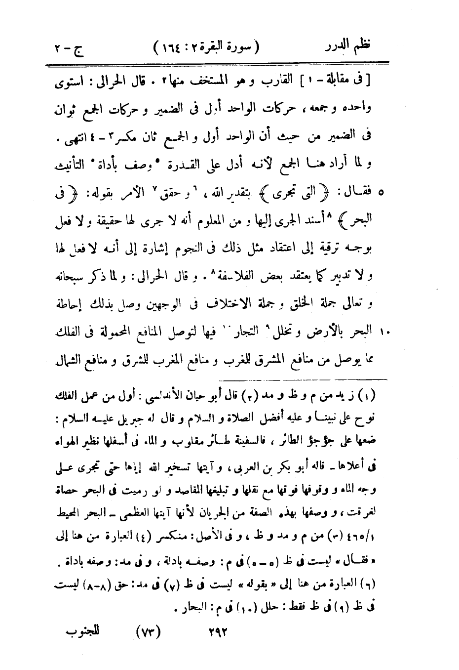 ولما أراد هنا الجمع لأنه أدل على القدرة وصف بأداة التأنيث فقال {التي تجري} بتقدير الله، وحقق الأمر بقوله: {في البحر} أسند الجري إليها ومن المعلوم أنه لا جري لها حقيقة ولا فعل بوجه ترقية إلى اعتقاد مثل ذلك في النجوم إشارة إلى أنه لا فعل لها ولا تدبير كما يعتقد بعض الفلاسفة. وقال الحرالي: ولما ذكر سبحانه وتعالى جملة الخلق وجملة الاختلاف في الوجهين وصل بذلك إحاطة البحر بالأرض وتخلل البحار فيها لتوصل المنافع المحمولة في الفلك مما يوصل من منافع المشرق للمغرب ومنافع المغرب للمشرق ومنافع الشمال