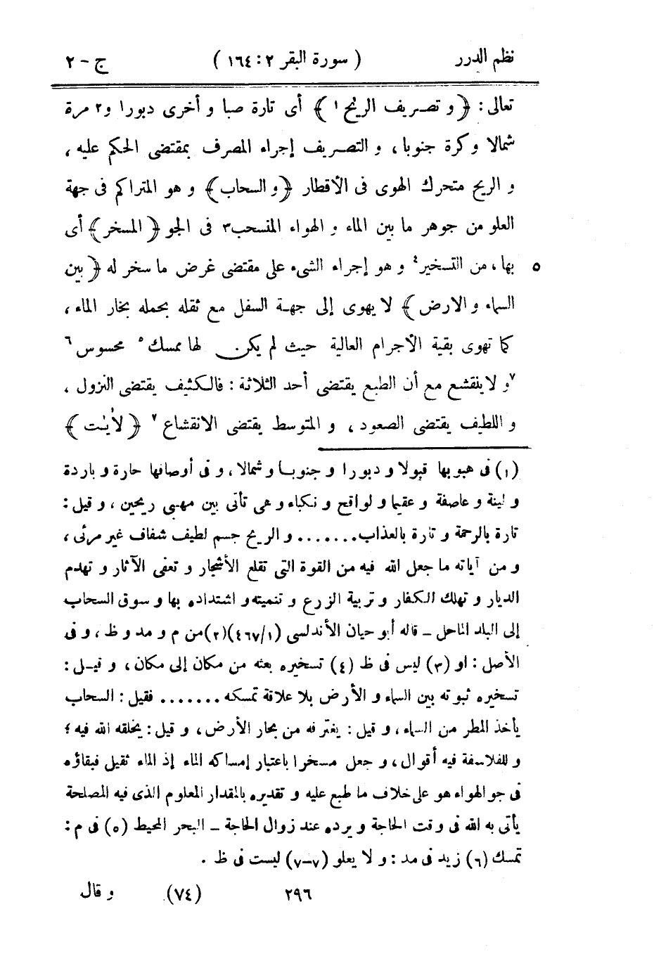 تعالى: {وتصريف الرياح} أي تارة صباً وأخرى دبوراً ومرة شمالاً وكرة جنوباً، والتصريف إجراء المصرف بمقتضى الحكم عليه، والريح متحرك الهوى في الأقطار {والسحاب} وهو المتراكم في جهة العلو من جوهر ما بين الماء والهواء المنسحب في الجو {المسخر} أي بها، من التسخير وهو إجراء الشيء على مقتضى غرض ما سخر له {بين السماء والأرض} لا يهوى إلى جهة السفل مع ثقله بحمله بخار الماء، كما تهوى بقية الأجرام العالية حيث لم يكن لها ممسك محسوس ولا ينقشع مع أن الطبع يقتضي أحد الثلاثة: فالكثيف يقتضي النزول واللطيف يقتضي الصعود، والمتوسط يقتضي الانقشاع {لآيات}