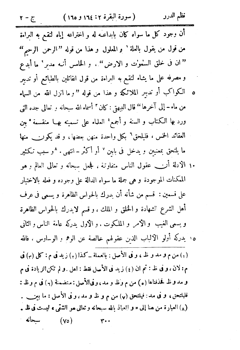 أن وجود كل ما سواه كان بإبداعه له واختراعه إياه لتقع به البراءة من قول من يقول بالعلة والمعلول وهذا من قوله {الرحمن الرحيم} [البقرة: 163] {إن في خلق السماوات والأرض} [البقرة: 164] ، والخامس أنه مدبر ما أبدع ومصرفه على ما يشاء لتقع به البراءة من قوله القائلين بالطبائع أو تدبير الكواكب أو تدبير الملائكة وهذا من قوله {وما أنزل الله من السماء من ماء} [البقرة: 164] إلى آخرها قال البيهقي: كان أسماء الله سبحانه وتعالى جده التي ورد بها الكتاب والسنة وأجمع العلماء على تسميته بها منقسمة بين العقائد الخمس، فليلحق بكل واحدة منهن بعضها، وقد يكون منها ما يلتحق بمعنيين ويدخل في بابين أو أكثر - انتهى. وسبب تكثير الأدلة أن عقول الناس متفاوتة، فجعل سبحانه وتعالى العالم وهو الممكنات الموجودة وهي جملة ما سواه الدالة على وجوده وفعله بالاختيار على قسمين: قسم من شأنه أن يدرك بالحواس الظاهرة ويسمى في عرف أهل الشرع الشهادة والخلق والملك، وقسم لا يدرك بالحواس الظاهرة ويسمى الغيب والأمر والملكوت، والأول يدركه عامة الناس والثاني يدركه أولو الألباب الذين عقولهم خالصة عن الوهم والوساوس، فالله