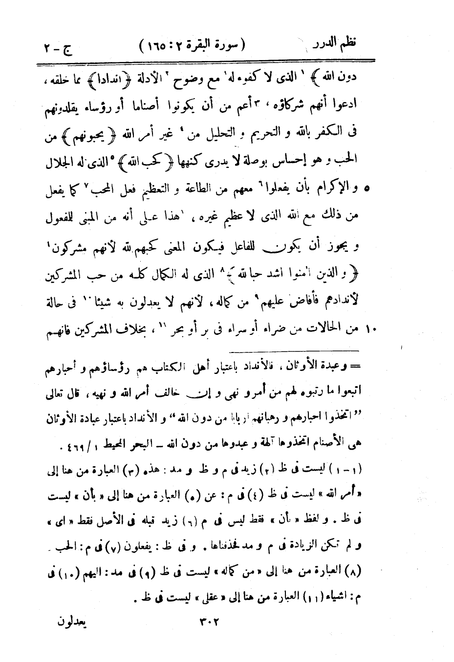 دون الله} الذي لا كفؤ له مع وضوح الأدلة {أنداداً} مما خلقه، ادعوا أنهم شركاؤه، أعم من أن يكونوا أصناماً أو رؤساء يقلدونهم في الكفر بالله والتحريم والتحليل من غير أمر الله {يحبونهم} من الحب وهو إحساس بوصلة لا يدرى كنهها {كحب الله} الذي له الجلال والإكرام بأن يفعلوا معهم من الطاعة والتعظيم فعل المحب كما يفعل من ذلك مع الله الذي لا عظيم غيره، هذا على أنه من المبني للمفعول ويجوز أن يكون للفاعل فيكون المعنى كحبهم لله لأنهم مشركون {والذين آمنوا أشد حباً لله} الذي له الكمال كله من حب المشركين لأندادهم فأفاض عليهم من كماله، لأنهم لا يعدلون به شيئاً في حالة من الحالات من ضراء أو سراء في بر أو بحر، بخلاف المشركين فإنهم