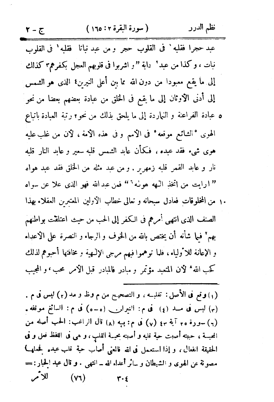 {وأشربوا في قلوبهم العجل بكفرهم} [البقرة: 93] كذلك إلى ما يقع معبوداً من دون الله ما بين أعلى النيرين الذي هو الشمس إلى أدنى الأوثان إلى ما يقع في الخلق من عبادة بعضهم بعضاً من نحو عبادة الفراعنة والنماردة إلى ما يلحق بذلك من نحو رتبة العبادة باتباع الهوى الشائع موقعه في الأمم وفي هذه الأمة، لأن من غلب عليه هوى شيء فقد عبده، فكأن عابد الشمس قلبه سعير وعابد النار قلبه نار وعابد القمر قلبه زمهرير، ومن عبد مثله من الخلق فقد عبد هواه {أرأيت من اتخذ إلهه هواه} [الفرقان: 43] فمن عبد الله فهو الذي علا عن سواه من المخلوقات فعادل سبحانه وتعالى خطاب الأولين المعتبرين العقلاء بهذا الصنف الذي انتهى أمرهم في الكفر إلى الحب من حيث اعتقلت بواطنهم بهم فيما شأنه أن يختص بالله من الخوف والرجاء والنصرة على الأعداء والإعانة للأولياء، فلما توهموا فيهم مرجى الإلهية، ومخافتها أحبوهم لذلك كحب الله لأن المتعبد مؤتمر ومبادر فالمبادر قبل الأمر محب، والمجيب