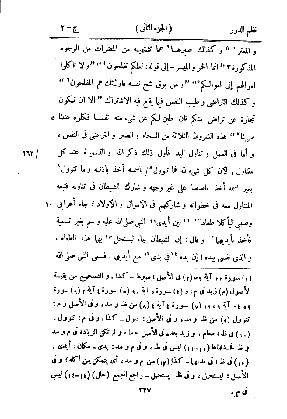 والمعتر} [الحج: 36] وكذلك صبرها عما تشتهيه من المضرات من الوجوه المذكورة {إنما الخمر والميسر} [المائدة: 90] إلى قوله {لعلكم تفلحون} {ولا تأكلوا أموالهم إلى أموالكم} [النساء: 2] {ومن يوق شح نفسه فأولئك هم المفلحون} [الحشر: 9 والتغابن: 16] وكذلك التراضي وطيب النفس فيما يقع فيه الاشتراك {إلا أن تكون تجارة عن تراض منكم} [النساء: 29] {فإن طبن لكم عن شيء منه نفساً فكلوه هنيئاً مريئاً} [النساء: 4] هذه الشروط الثلاثة من السخاء والصبر والتراضي في النفس، وأما في العمل وتناول اليد فأول ذلك ذكر الله والتسمية عند كل متناول، لأن كل شيء لله فما تنوول باسمه أخذ بإذنه وما تنوول بغير اسمه أخذ تلصصاً على غير وجهه وشارك الشيطان في تناوله فتبعه المتناول معه في خطواته وشاركهم في الأموال والأولاد؛ جاء أعرابي وصبي ليأكلا طعاماً بين أيدي النبي صَلَّى اللهُ عَلَيْهِ وَسَلَّمَ بغير تسمية فأخذ بأيديهما وقال «إن الشيطان جاء ليستحل بهما هذا الطعام، والذي نفسي بيده! إن يده في يدي مع أيديهما» فسمى النبي صَلَّى اللهُ عَلَيْهِ وَسَلَّمَ