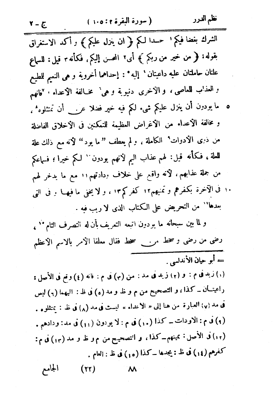 الشرك بغضاً فيكم حسداً لكم {أن ينزل عليكم} وأكد الاستغراق بقوله: {من خير من ربكم} أي المحسن إليكم، فكأنه قيل: للسماع علتان حاملتان عليه داعيتان إليه: إحداهما أخروية وهي النعيم للمطيع والعذاب للعاصي، والأخرى دنيوية وهي مخالفة الأعداء، فإنهم ما يودون أن ينزل عليكم شيء لكم فيه خير فضلاً عن أن تمتثلوه، ومخالفة الأعداء من الأغراض العظيمة للمتمكنين في الأخلاق الفاضلة من ذوي الأدوات الكاملة، ولم يعطف {ما يود} لأنه مع ذلك علة للعلة، فكأنه قيل: لهم عذاب أليم لأنهم يودون لكم خيراً؛ فسماعكم من جملة عذابهم، لأنه واقع على خلاف ودادتهم مع ما يدخر لهم في الآخرة بكفرهم وتمنيهم كفركم، ولا يخفى ما فيها وفي التي بعدها من التحريض على الكتاب الذي لا ريب فيه.