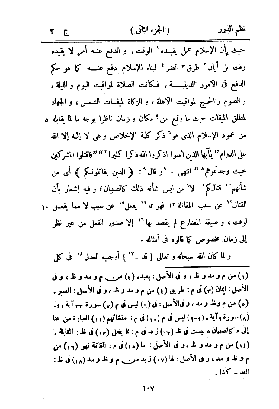 حيث إن الإسلام عمل يقيده الوقت، والدفع عنه أمر لا يقيده وقت بل أيان طرق الضر لبناء الإسلام دفع عنه كما هو حكم الدفع في الأمور الدينية، فكانت الصلاة لمواقيت اليوم والليلة، والصوم والحج لمواقيت الأهلة، والزكاة لميقات الشمس، والجهاد لمطلق الميقات حيث ما وقع من مكان وزمان ناظراً بوجه ما لما يقابله من عمود الإسلام الذي هو ذكر كلمة الإخلاص وهي لا إله إلا الله على الدوام {يا أيها الذين آمنوا اذكروا الله ذكراً كثيراً}