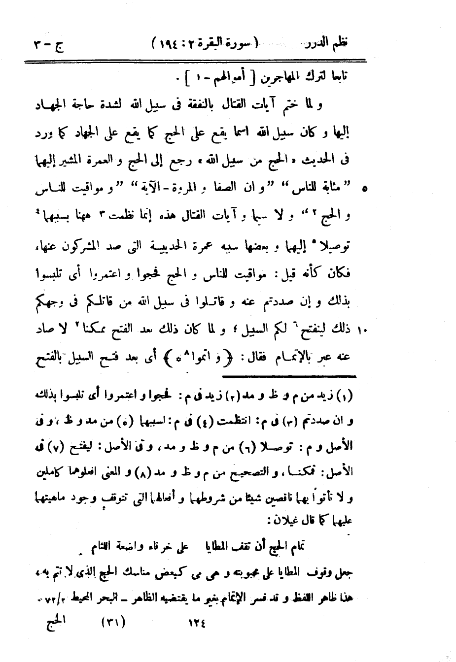 ولما ختم آيات القتال بالنفقة في سبيل الله لشدة حاجة الجهاد إليها وكان سبيل الله اسماً يقع على الحج كما يقع على الجهاد كما ورد في الحديث «الحج من سبيل الله» رجع إلى الحج والعمرة المشير إليهما {مثابة للناس} [البقرة: 125] و {إن الصفا والمروة} [البقرة: 158] الآية، و {مواقيت للناس والحج} ولا سيما وآيات القتال هذه إنما نظمت ههنا بسببهما توصيلاً إليهما وبعضها سببه عمرة الحديبية التي صدّ المشركون عنها، فكان كأنه قيل: مواقيت للناس والحج فحجوا واعتمروا أي تلبسوا بذلك وإن صددتم عنه وقاتلوا في سبيل الله من قاتلكم في وجهكم ذلك لينفتح لكم السبيل، ولما كان ذلك بعد الفتح ممكناً لا صاد عنه عبر بالإتمام فقال: {وأتموا *} أي بعد فتح السبيل بالفتح