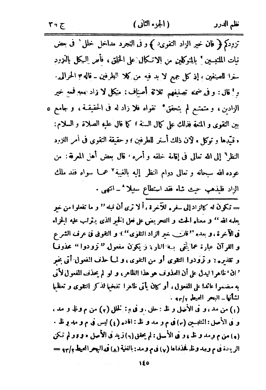 تزودكم {فإن خير الزاد التقوى} وفي التجرد مداخل خلل في بعض نيات الملتبسين بالمتوكلين من الاتكال على الخلق، فأمر الكل بالتزود ستراً للصنفين، إذ كل جمع لا بد فيه من كلا الطرفين - قاله الحرالي وقال: وفي ضمنه تصنيفهم ثلاثة أصناف: متكل لا زاد معه فمعه خير الزادين، ومتمتع لم يتحقق تقواه فلا زاد له في الحقيقة، وجامع بين التقوى والمتعة فذلك على كمال السنة؛ كما قال عليه الصلاة والسلام: «قيّدها وتوكل» لأن ذلك أستر للطرفين؛ وحقيقة التقوى في أمر التزود النظر إلى الله تعالى في إقامة خلقه وأمره، قال بعض أهل المعرفة: من عوده الله سبحانه وتعالى دوام النظر إليه بالغيبة عما سواه فقد ملك الزاد فليذهب حيث شاء فقد استطاع سبيلاً - انتهى.