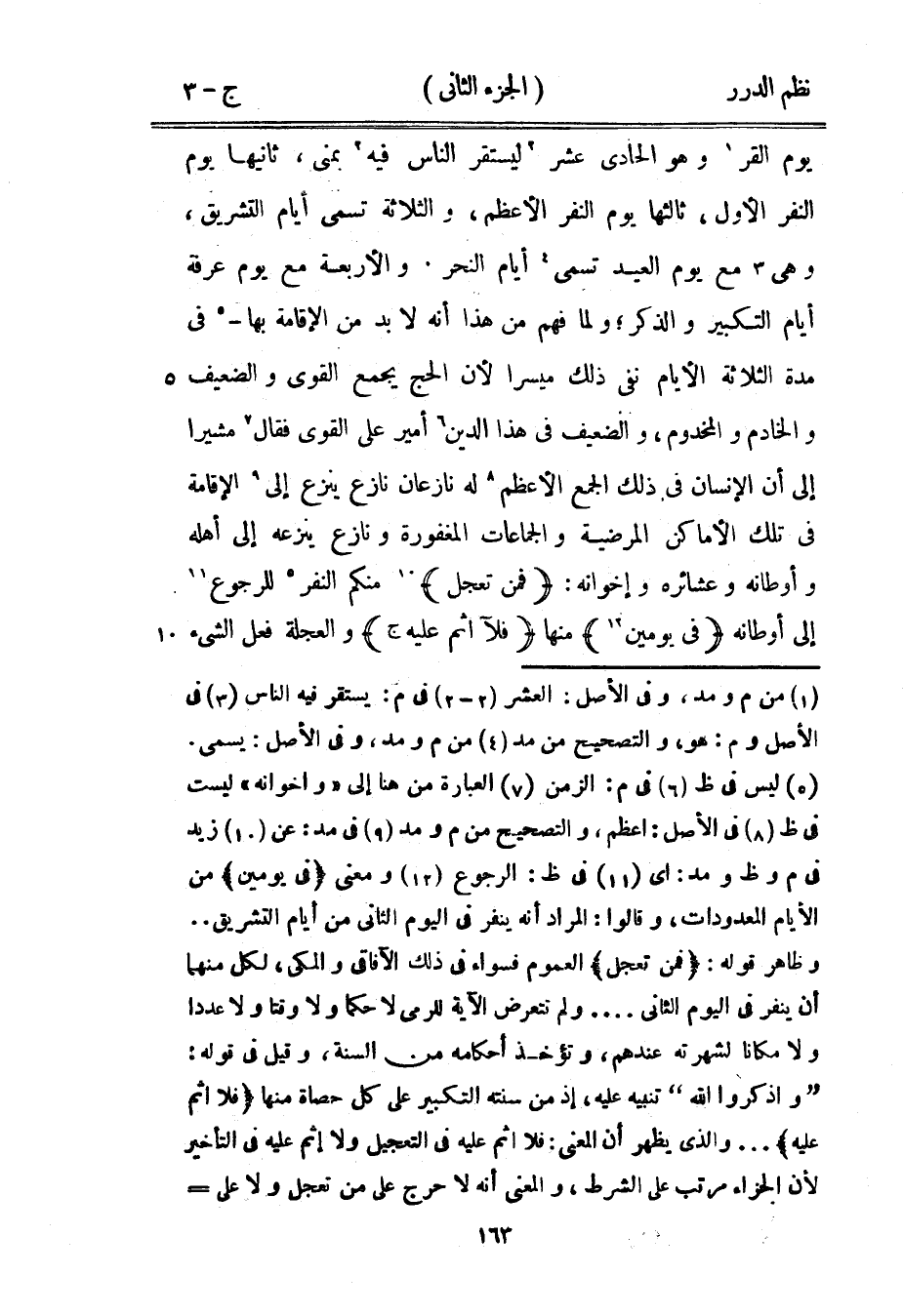 يوم القر، وهو الحادي عشر ليستقر الناس فيه بمنى، ثانيها يوم النفر الأول، ثالثها يوم النفر الأعظم، والثلاثة تسمى أيام التشريق، وهى مع يوم العيد تسمى أيام النحر. والأربعة مع يوم عرفة أيام التكبير والذكر، ولما فهم من هذا أنه لا بد من الإقامة بها - في مدة الثلاثة الأيام نفى ذلك ميسراً لأنّ الحج يجمع القوي والضعيف والخادم والمخدوم، والضعيف في هذا الدين أمير على القوي فقال مشيراً إلى أن الإنسان في ذلك الجمع الأعظم له نازعان نازع ينزع إلى الإقامة في تلك الأماكن المرضية والجماعات المغفورة ونازع ينزعه إلى أهله وأوطانه وعشائره وإخوانه: {فمن تعجل} منكم النفر للرجوع إلى أوطانه {في يومين} منها {فلآ إثم عليه} والعجلة فعل الشيء