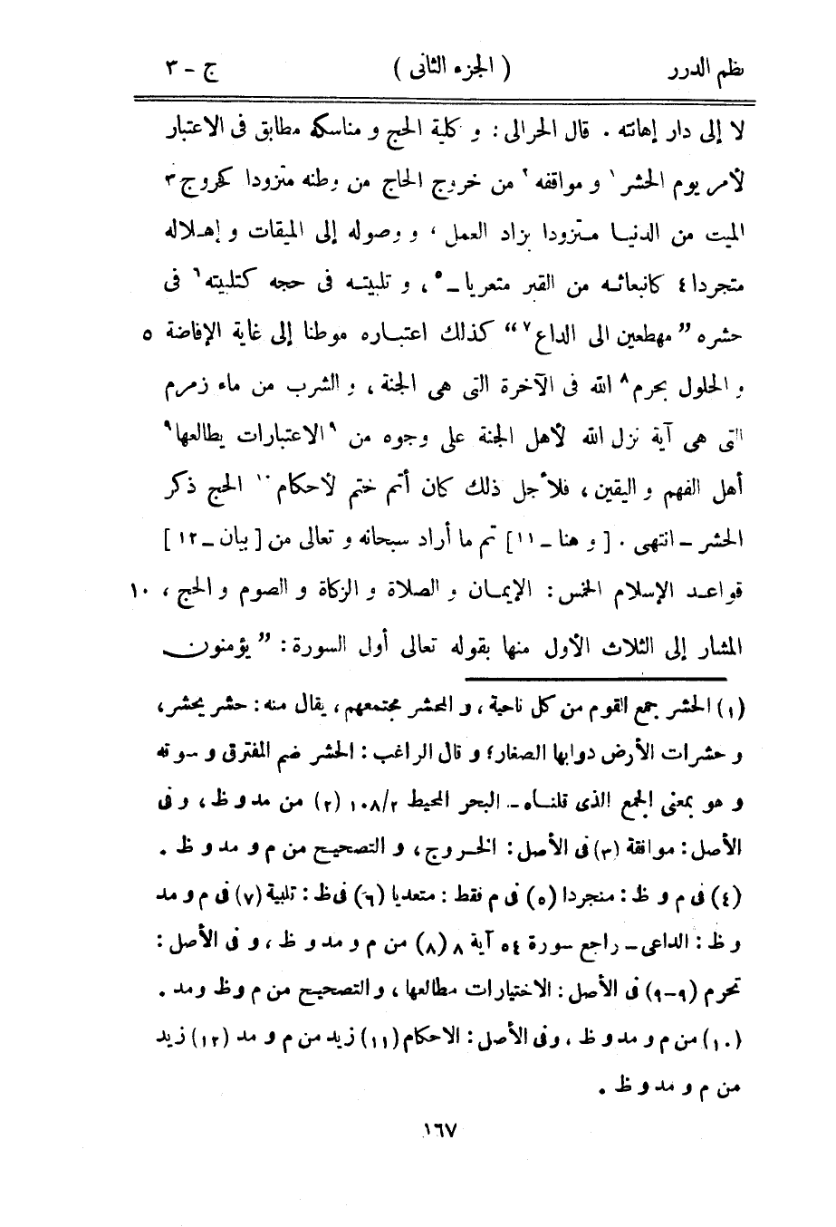 لا إلى دار إهانته. قال الحرالي: وكلية الحج ومناسكه مطابق في الاعتبار لأمر يوم الحشر ومواقفه من خروج الحاج من وطنه متزوداً كخروج الميت من الدنيا متزوداً بزاد العمل، ووصوله إلى الميقات وإهلاله متجرداً كانبعاثه من القبر متعرياً، وتلبيته في حجه كتلبيته في حشره {مهطعين إلى الداع} [القمر: 80] كذلك اعتباره موطناً إلى غاية الإفاضة والحلول بحرم الله في الآخرة التي هي الجنة، والشرب من ماء زمزم التي هي آية نزل الله لأهل الجنة على وجوه من الاعتبارات يطالعها أهل الفهم واليقين، فلأجل ذلك كان أتم ختم لأحكام الحج ذكر الحشر - انتهى. وهنا تم ما أراد سبحانه وتعالى من بيان قواعد الإسلام الخمس: الإيمان والصلاة والزكاة والصوم والحج، المشار إلى الثلاث الأول منها بقوله تعالى أول السورة: {يؤمنون
