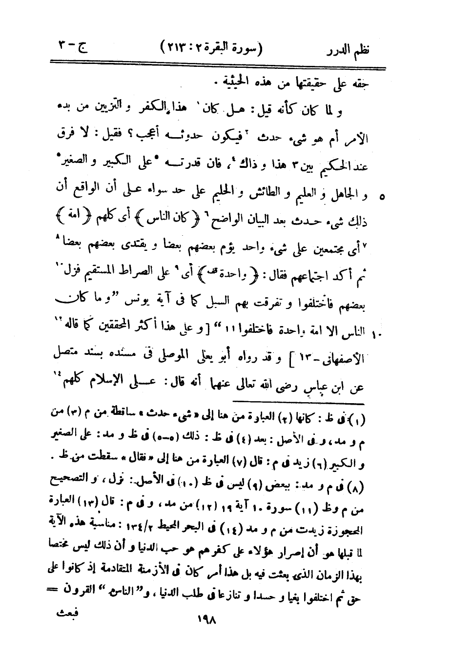 ولما كان كأنه قيل: هل كان هذا الكفر والتزيين من بدء الأمر أم هو شيء حدث فيكون حدوثه أعجب؟ فقيل: لا فرق عند الحكيم بين هذا وذاك، فإن قدرته على الكبير والصغير والجاهل والعليم والطائش والحليم على حد سواء على أن الواقع أن ذلك شيء حدث بعد البيان والواضح {كان الناس} أي كلهم {أمة} أي مجتمعين على شيء واحد يؤم بعضهم بعضاً ويقتدي بعضهم بعضاً ثم أكد اجتماعهم فقال: {واحدة} أي على الصراط المستقيم فزل بعضهم فاختلفوا وتفرقت بهم السبل كما في آية يونس {وما كان الناس إلا أمة واحدة فاختلفوا} [يونس: 19] وعلى هذا أكثر المحققين كما قاله الأصفهاني وقد رواه أبو يعلى الموصلي في مسنده بسند متصل عن ابن عباس رضي الله تعالى عنهما أنه قال: على الإسلام كلهم
