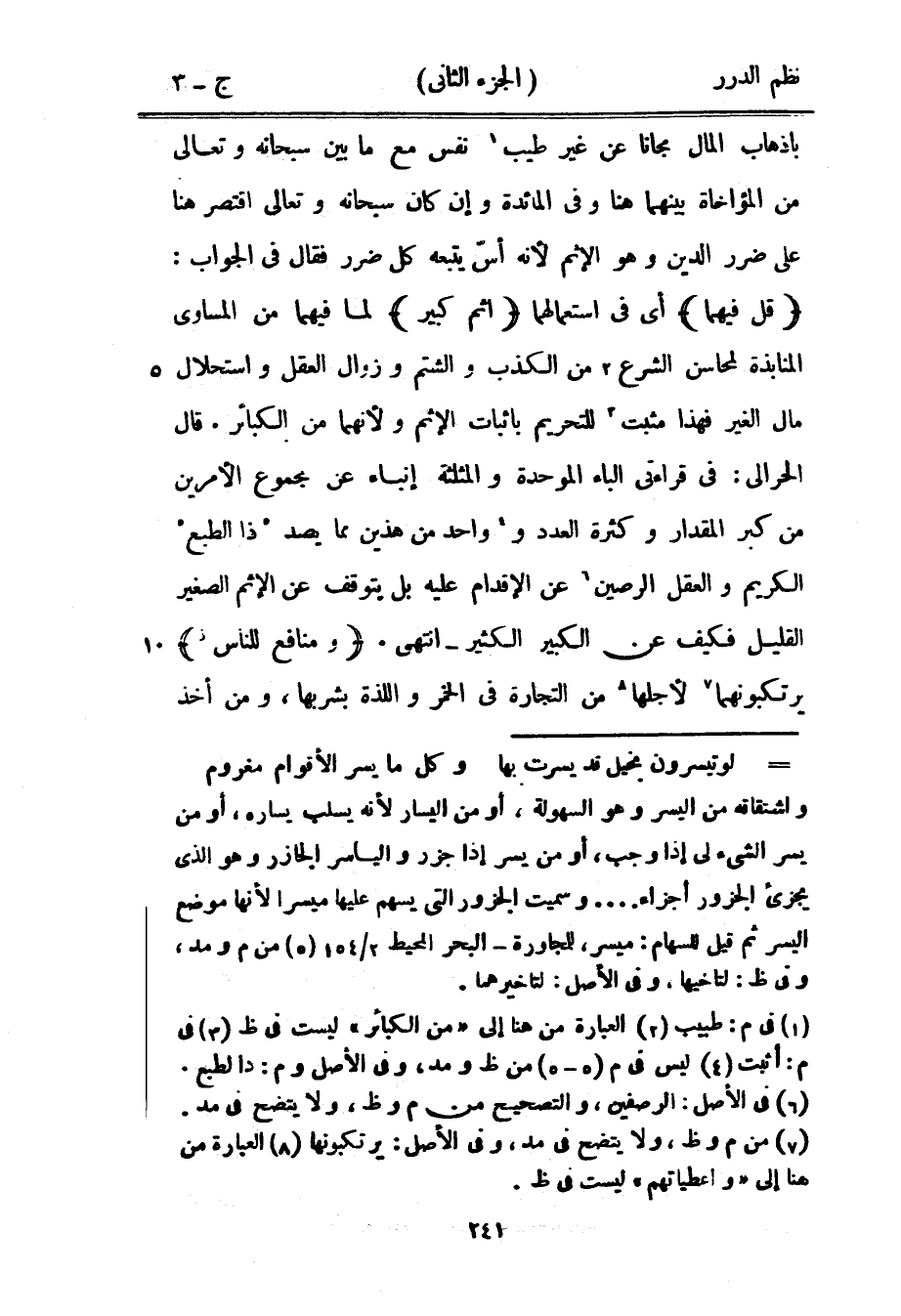 بإذهاب المال مجاناً عن غير طيب نفس ما بين سبحانه وتعالى من المؤاخاة بينهما هنا وفي المائدة وإن كان سبحانه وتعالى اقتصر هنا على ضرر الدين وهو الإثم لأنه أسّ يتبعه كل ضرر فقال في الجواب: {قل فيهما} أي في استعمالهما {إثم كبير} لما فيهما من المساوي المنابذة لمحاسن الشرع من الكذب والشتم وزوال العقل واستحلال مال الغير فهذا مثبت للتحريم بإثبات الإثم ولأنهما من الكبائر. قال الحرالي: في قراءتي الباء الموحدة والمثلثة إنباء عن مجموع الأمرين من كبر المقدار وكثرة العدد وواحد من هذين مما يصد ذا الطبع الكريم والعقل الرصين عن الإقدام عليه بل يتوقف عن الإثم الصغير القليل فكيف عن الكبير الكثير - انتهى. {ومنافع للناس} يرتكبونهما لأجلها من التجارة في الخمر واللذة بشربها، ومن أخذ