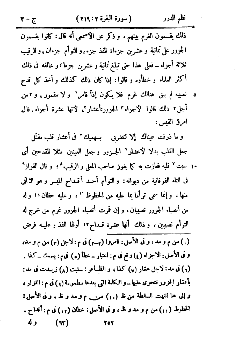 ذلك يقسمون الغرم بينهم. وذكر عن الأصمعي أنه قال: كانوا يقسمون الجزور على ثمانية وعشرين جزءاً: للفظ جزء، وللتوأم جزءان، وللرقيب ثلاثة أجزاء - فعلى هذا حتى تبلغ ثمانية وعشرين جزءاً؛ وخالفه في ذلك أكثر العلماء وخطؤوه وقالوا: إذا كان ذلك كذلك وأخذ كل قدح نصيبه لم يبق هنالك غرم فلا يكون إذاً قامر ولا مقمور، ومن أجل ذلك قالوا لأجزاء الجزور: أعشار، لأنها عشرة أجزاء، قال امرؤ القيس.